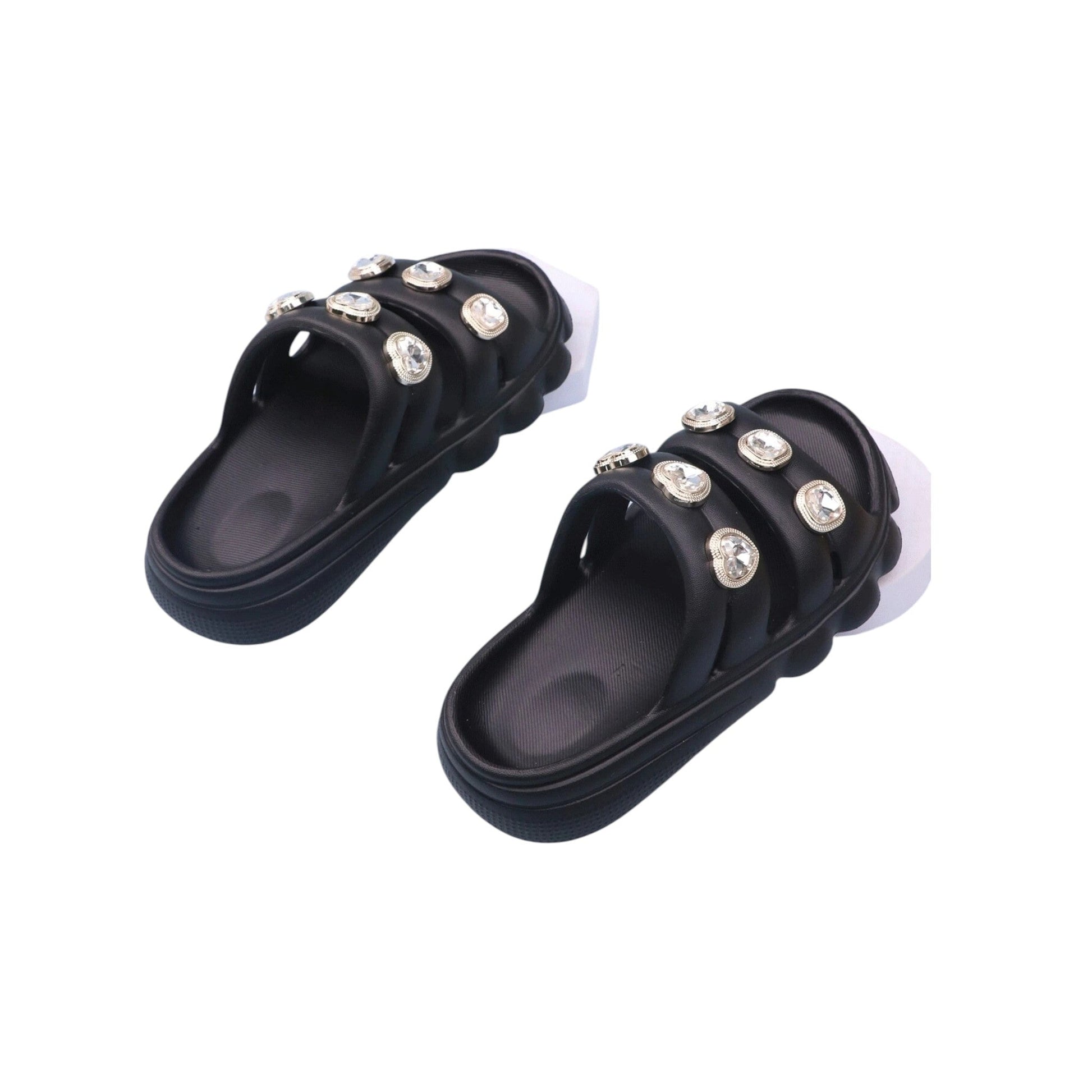 Címke nélküli, fekete, strasszokkal díszített, csúszásmentes papucs. Belső talp hossz: 18cm