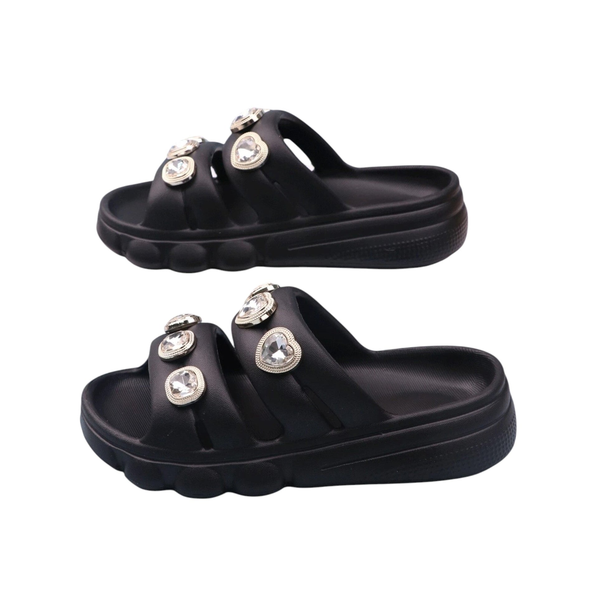Címke nélküli, fekete színű, platform talpú papucs, szív alakú strasszkövekkel díszítve. Belső talp hossz: 20,5cm