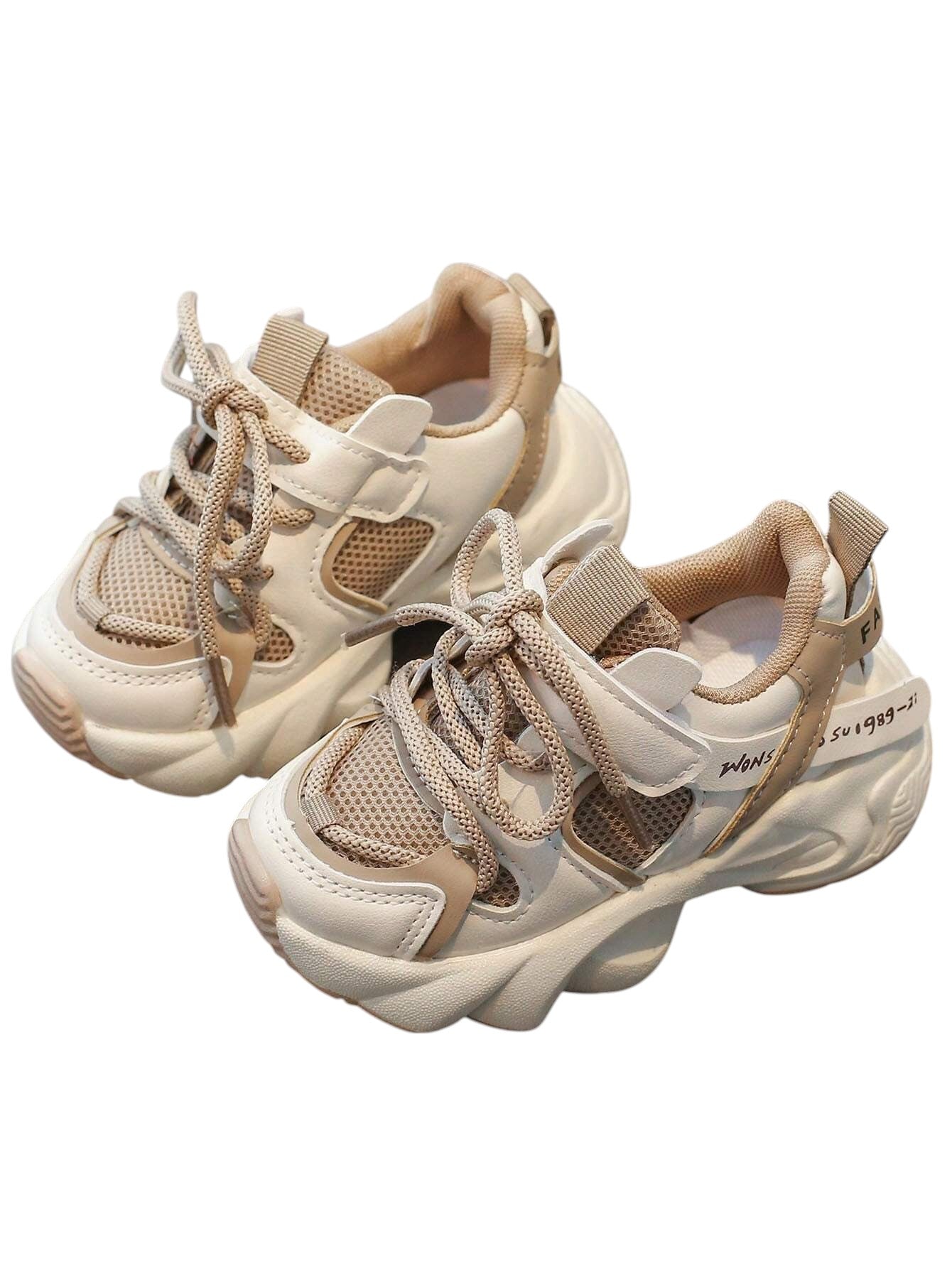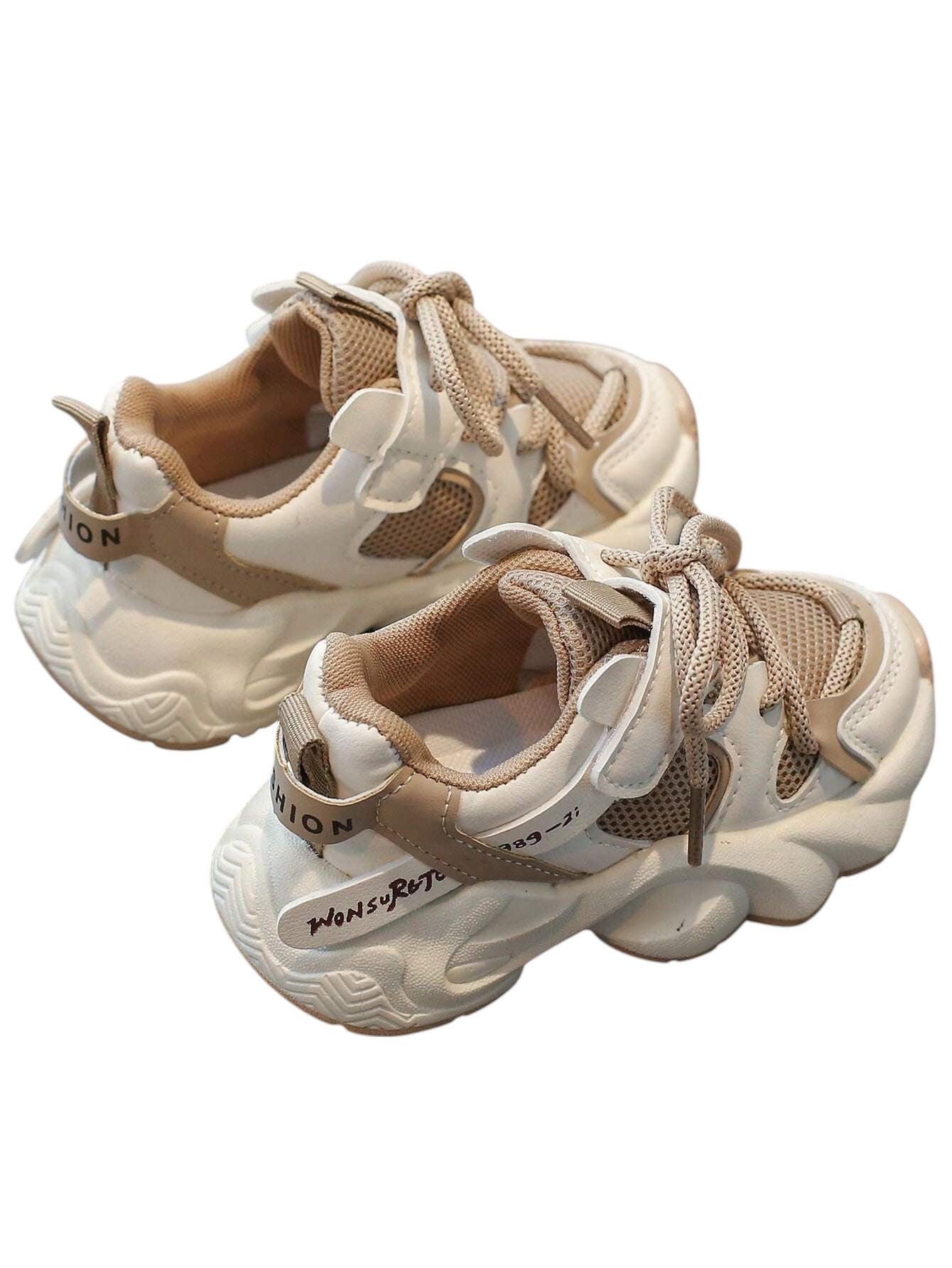 Címke nélküli, bézs és fehér színű, fűzős sportos babacipő. Belső talp hossz: 14cm