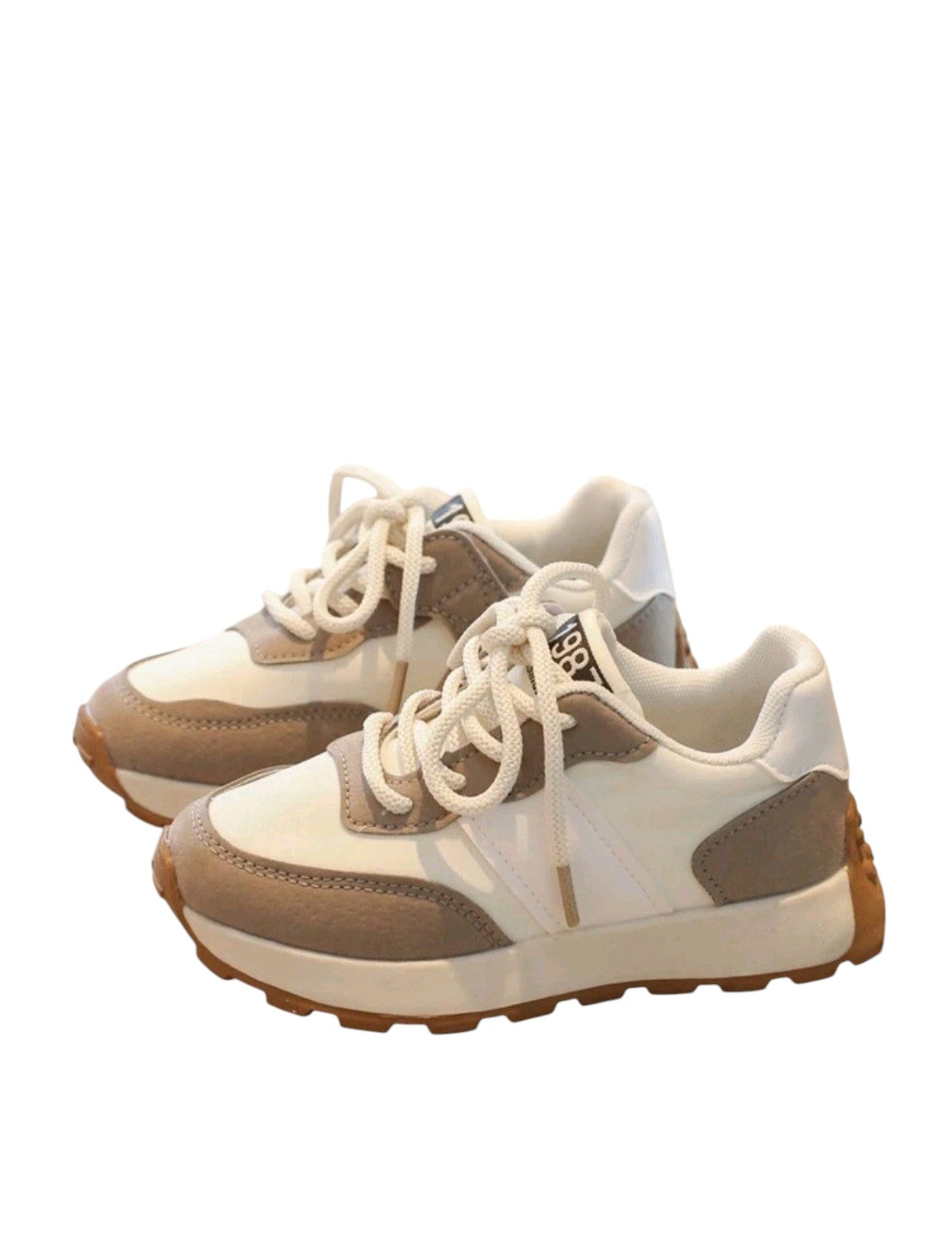 Címke nélküli, fehér és bézs, szintetikus és textil, sportcipő fazon, fűzős, vastagabb gumitalp, "198X" felirat a nyelven (pontos szám nem olvasható). Belső talp hossz: 19cm