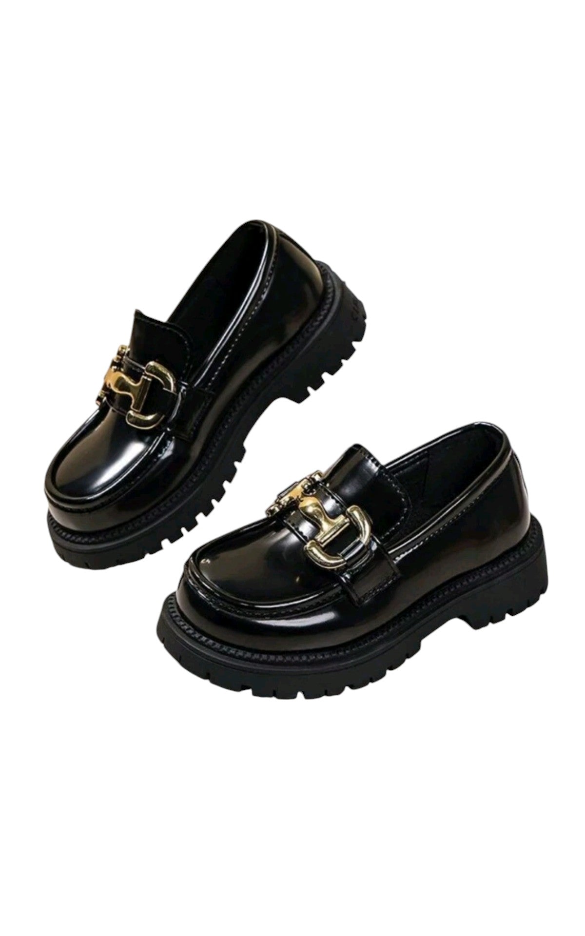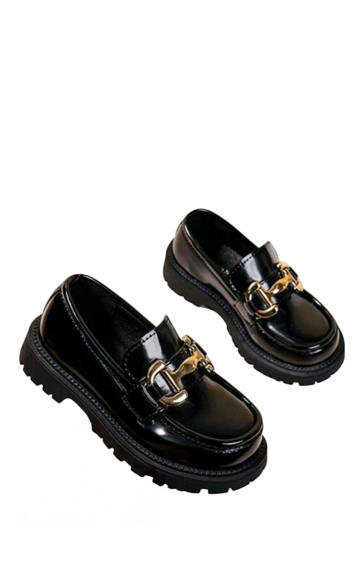 Címke nélküli, fekete, lakkbőr hatású szintetikus, loafer fazon, kerek orr, elöl arany színű fémcsattal, vastag, recés gumitalp. Belső talp hossz: 15,5cm