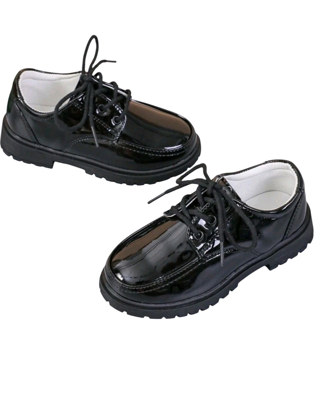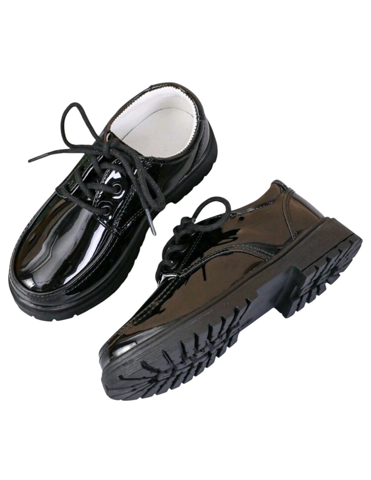 Címke nélküli, fekete, lakkbőr hatású szintetikus, fűzős félcipő fazon, kerek orr, vastagabb gumitalp. Belső talp hossz: 16cm