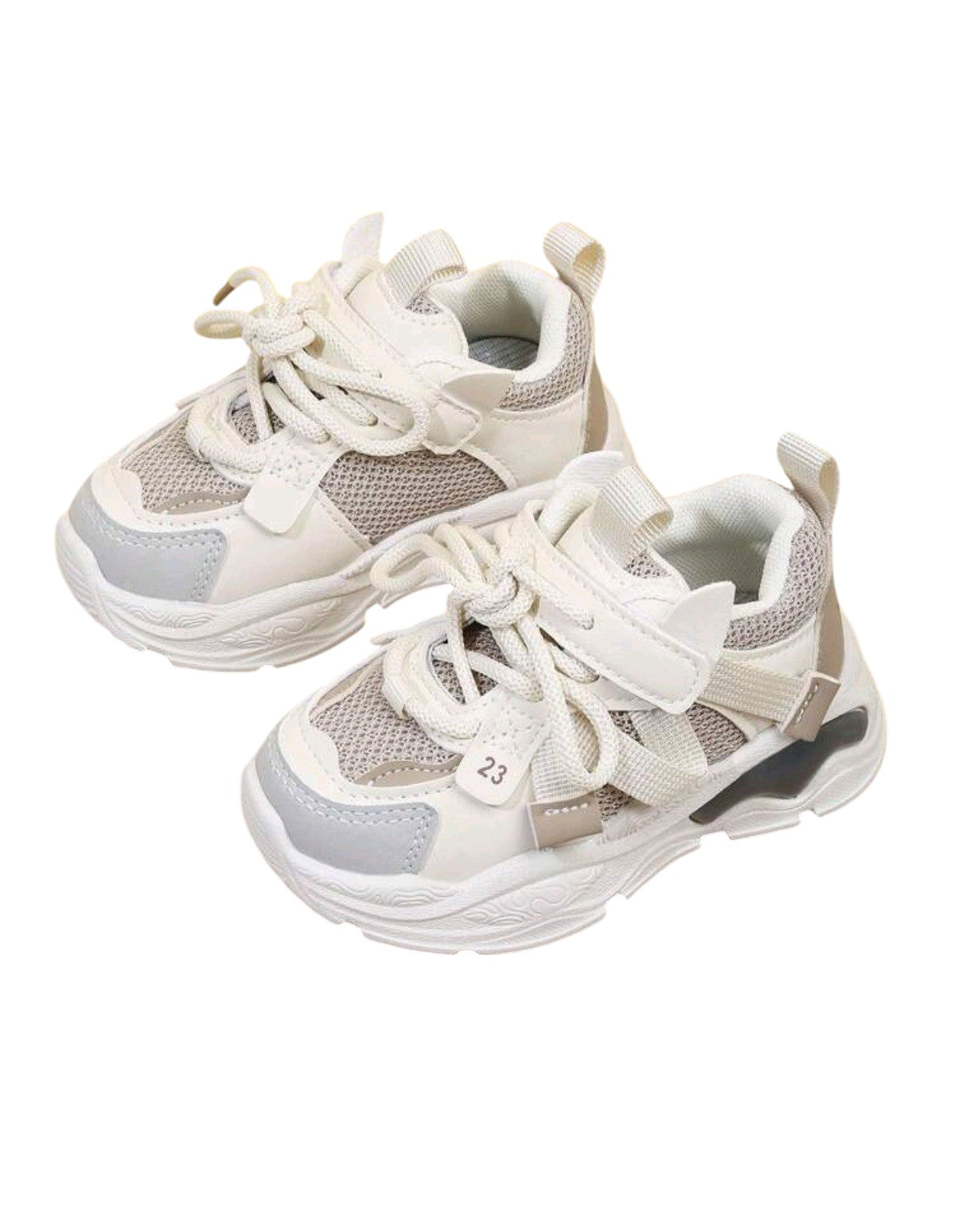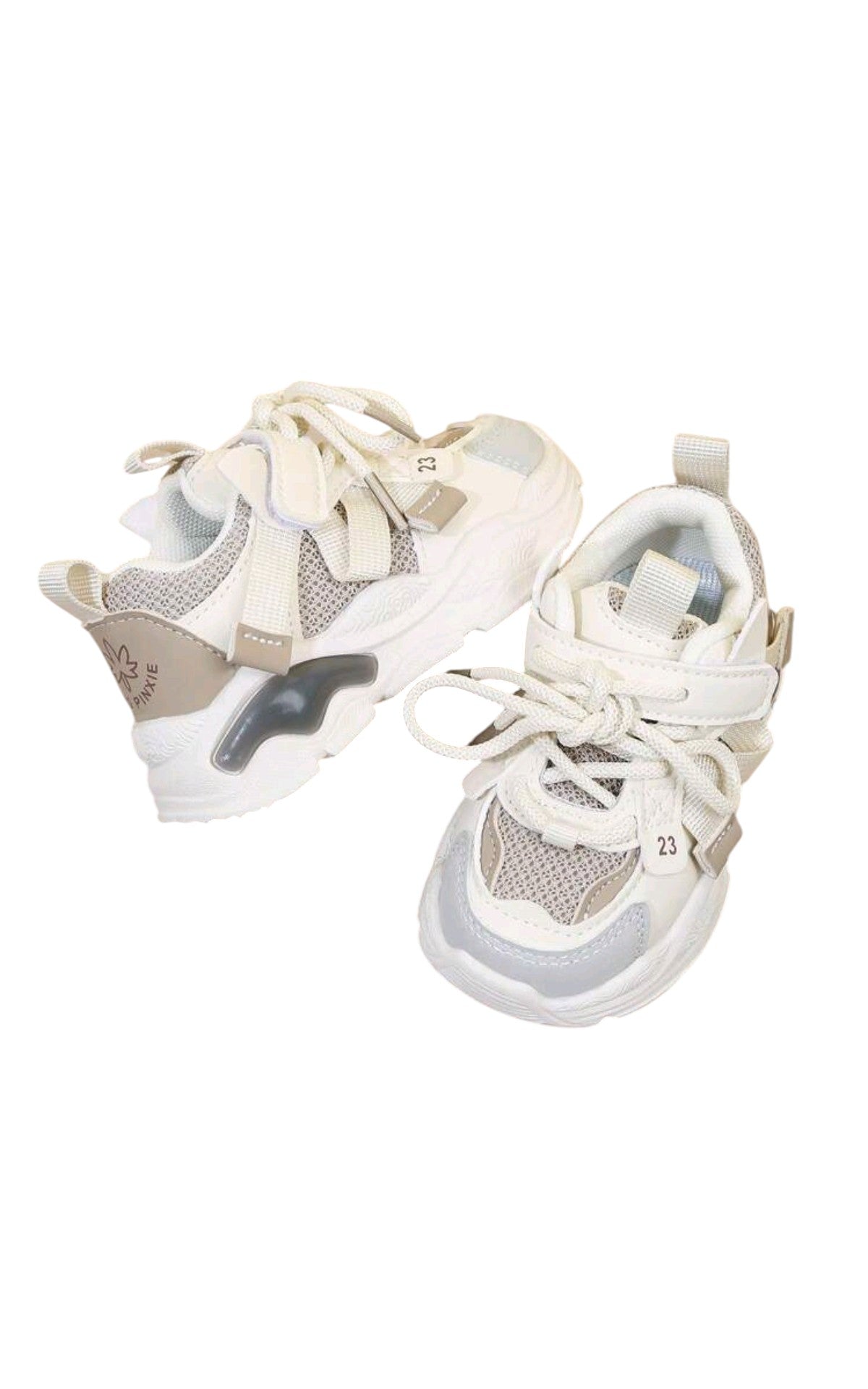 Címke nélküli, fehér és bézs, textil és szintetikus, sportcipő fazon, tépőzáras pánt és fűzős, hálós betétekkel, vastag, tagolt gumitalp. Belső talp hossz: 13cm