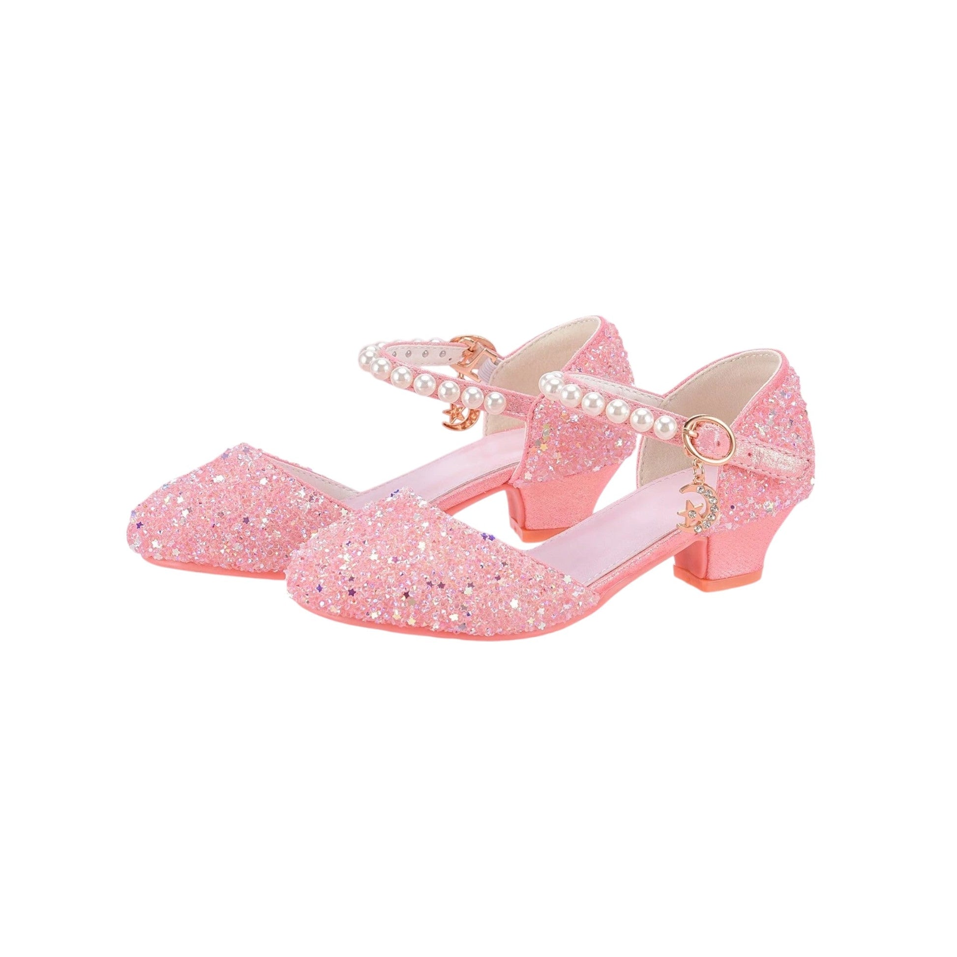 Címke nélküli, rózsaszín, csillogó, gyöngyös pántú, bokapántos, alacsony sarkú cipő.