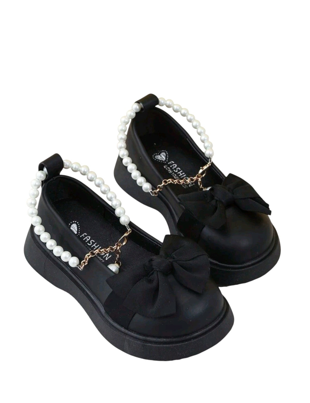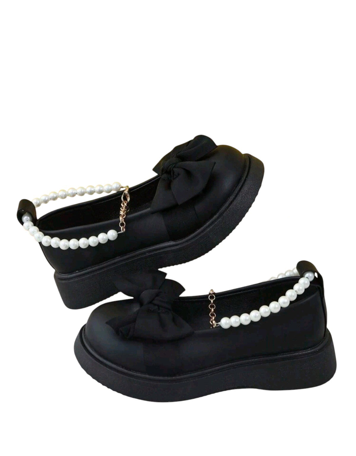 Címke nélküli, fekete, szintetikus, platform Mary Jane fazon, kerek orr, elöl masnival, gyöngyös pánt a lábfejen arany lánc dísszel. Belső talp hossz: 21cm