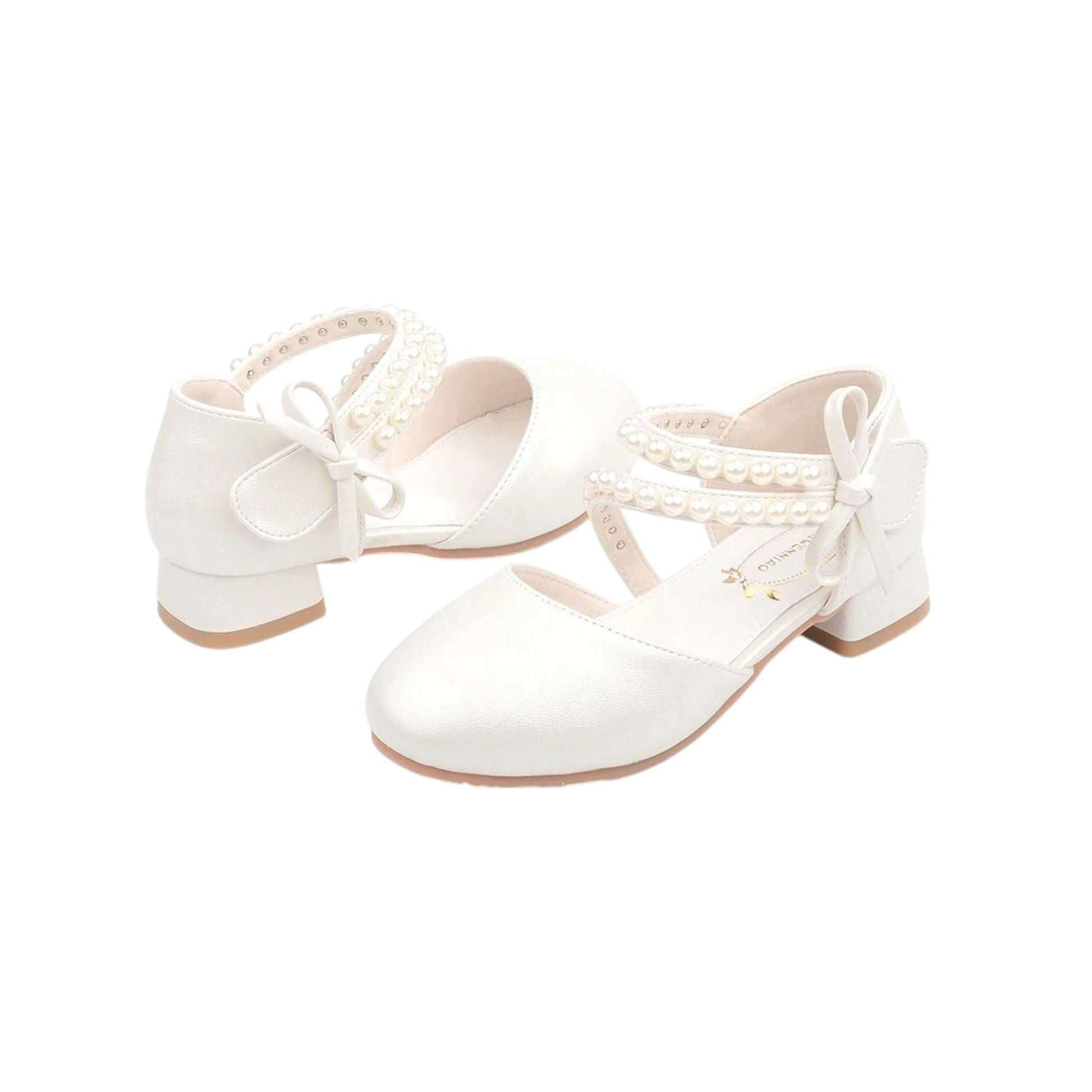 Címke nélküli, fehér, gyöngyökkel díszített pántokkal, bokapánttal, vastag sarokkal, nyitott orrú szandál.