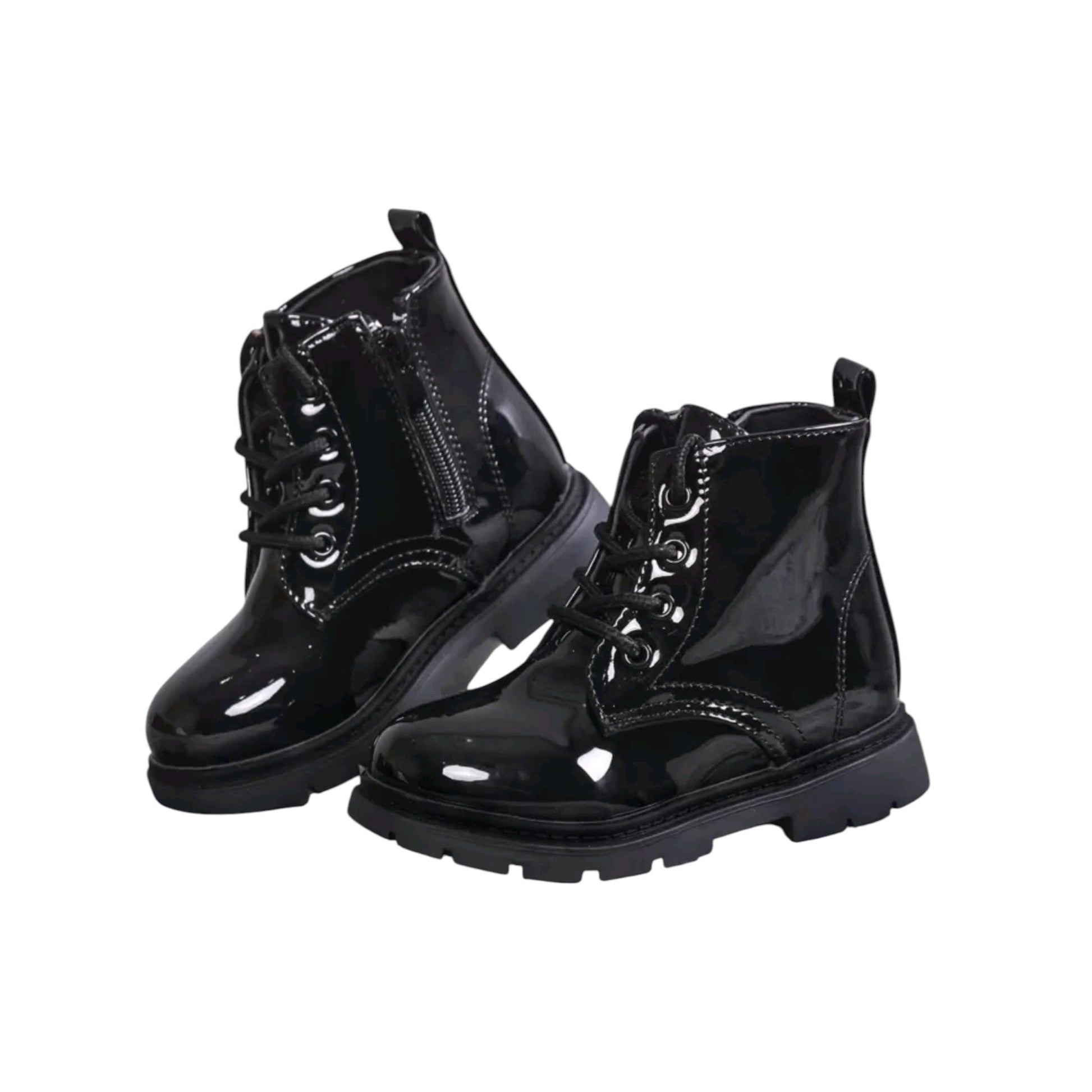 Címke nélküli, fekete, fényes lakk anyagú, fűzős, cipzáras, vastag talpú bakancs. Belső talp hossz: 16cm