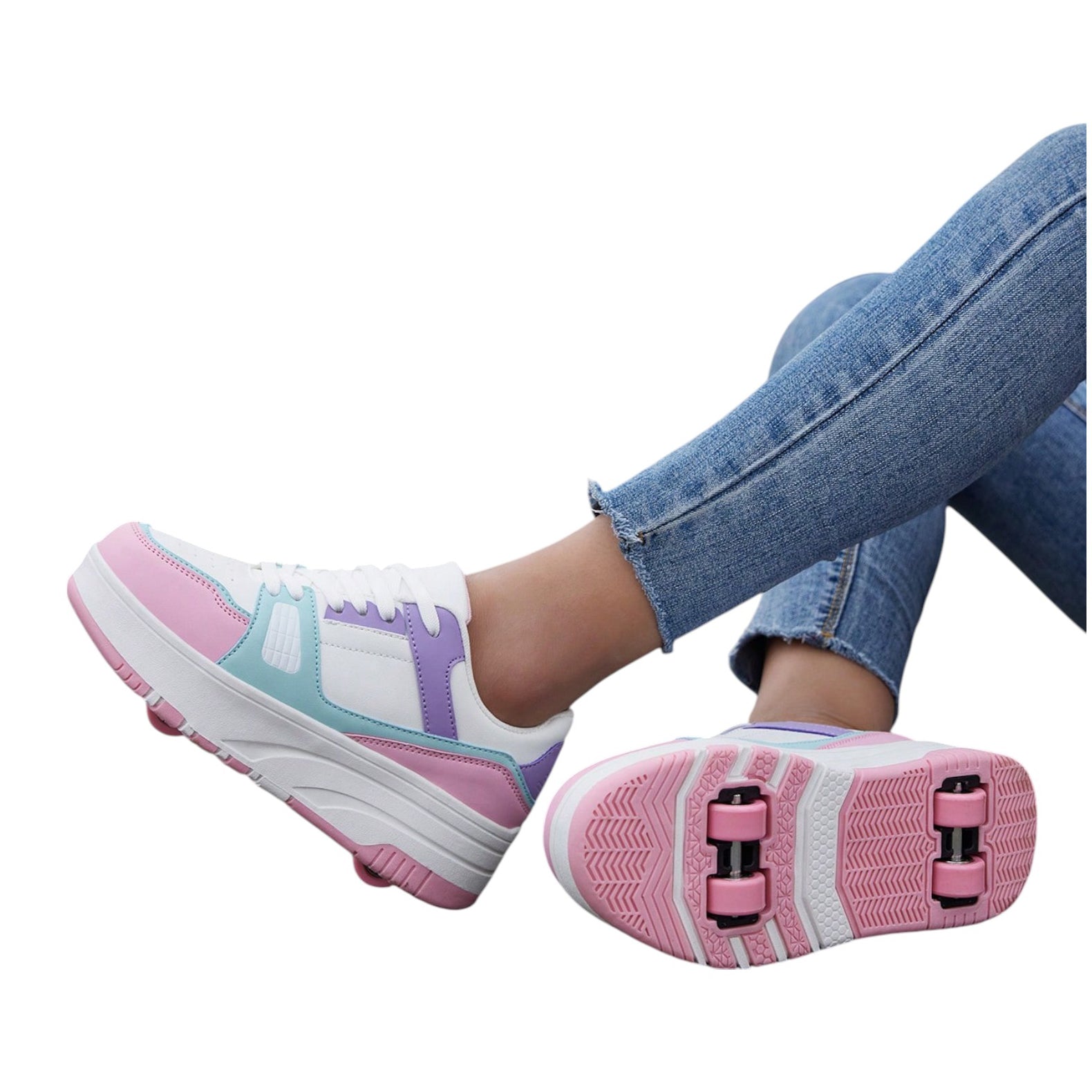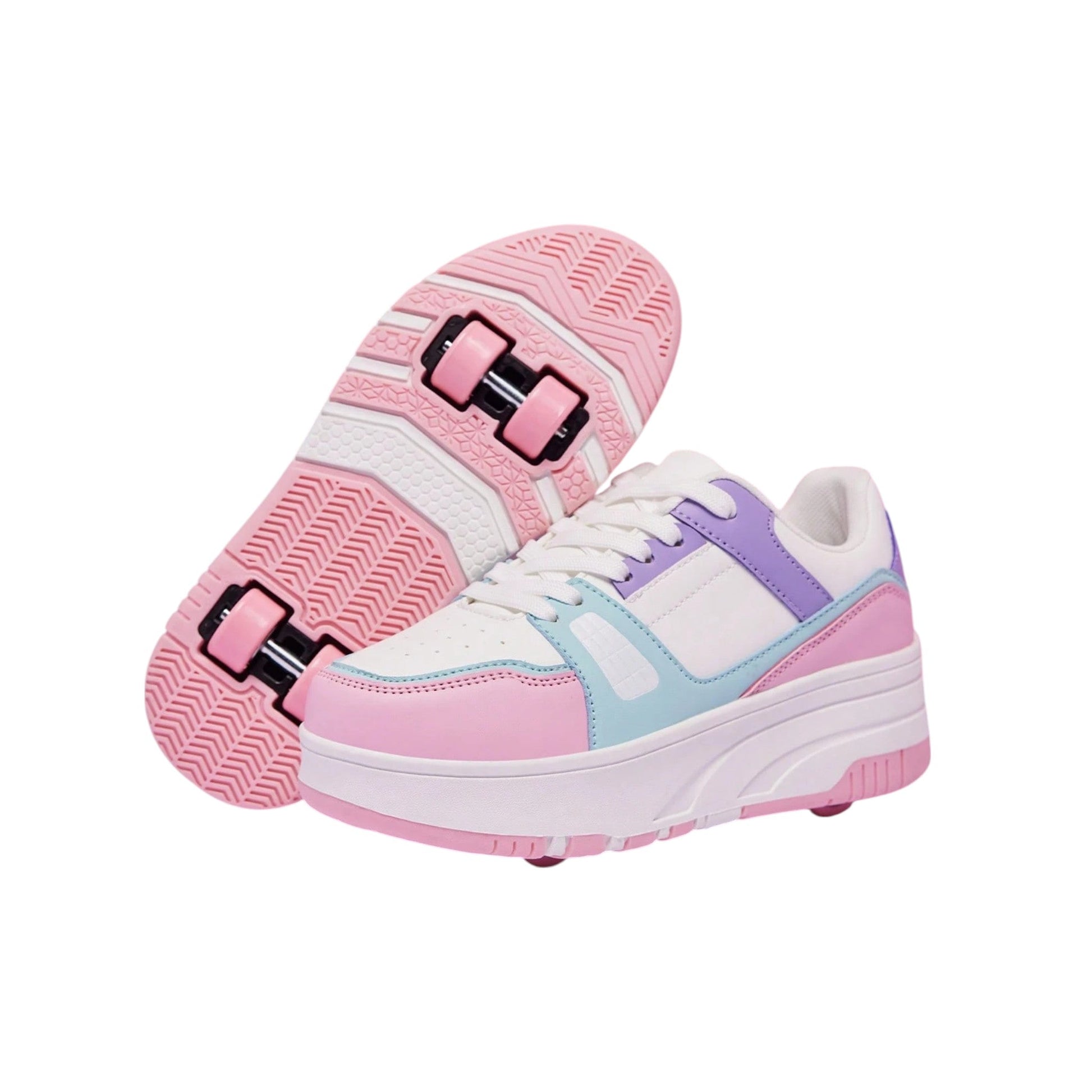 Címke nélküli, fehér, rózsaszín, lila, világoskék színkombináció, kerekekkel a talpán, fűzős.