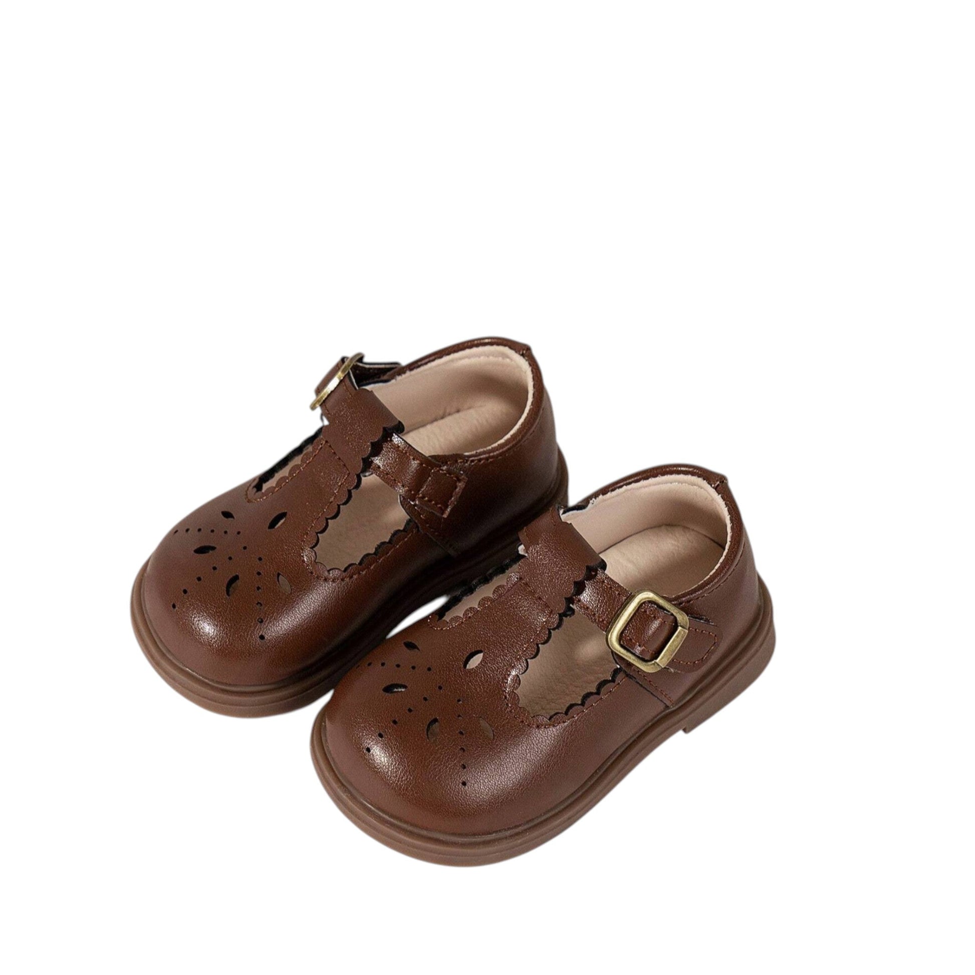 Címke nélküli, barna, lyukasztott mintával és hullámos szegéllyel, T-pántos, csatos, vastag talpú, alacsony sarkú.