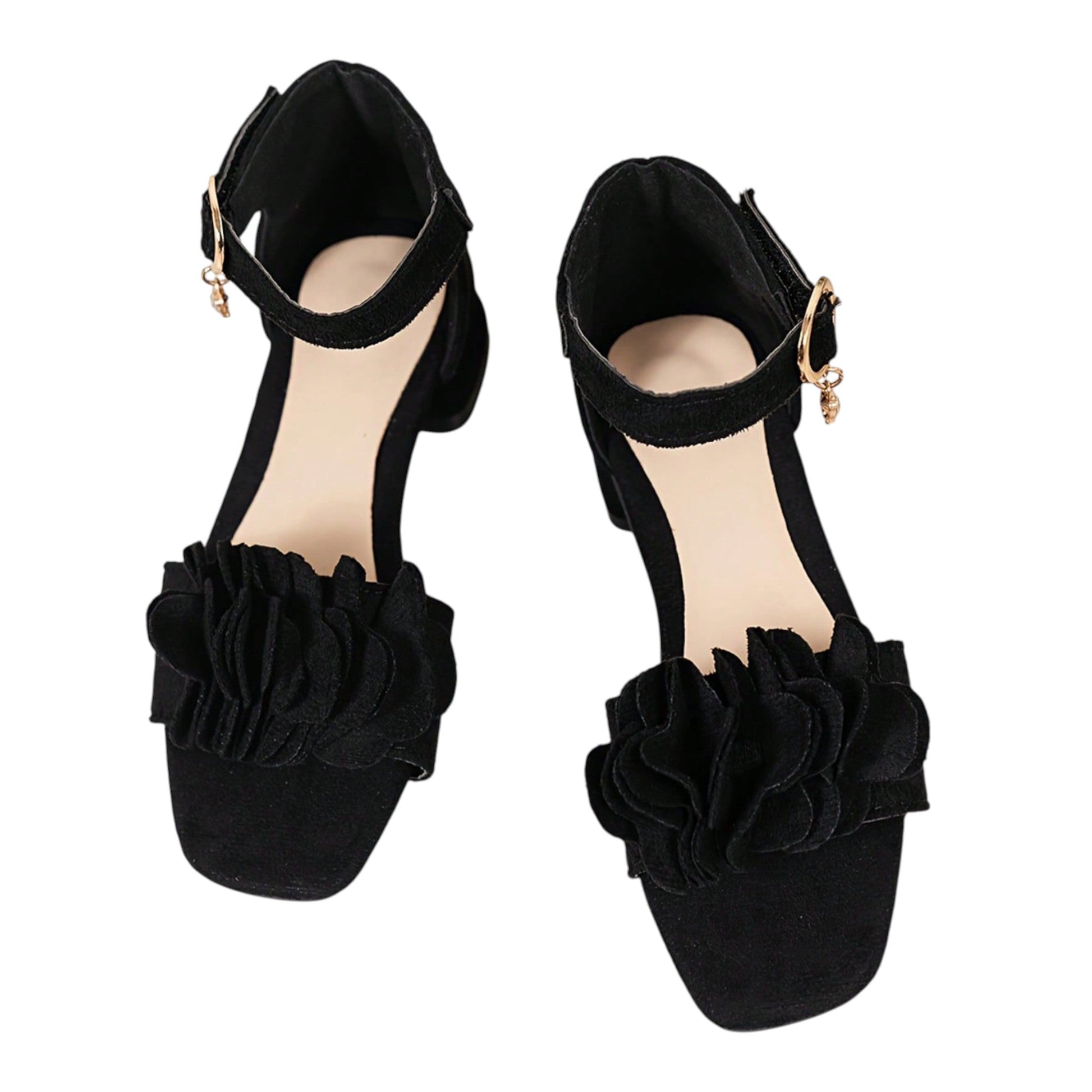 Címke nélküli, fekete, széles, fodros pánttal elől, szögletes orrú, vastag sarkú, bokapántos, csatos, lógó díszítéssel. Belső talp hossz: 21cm