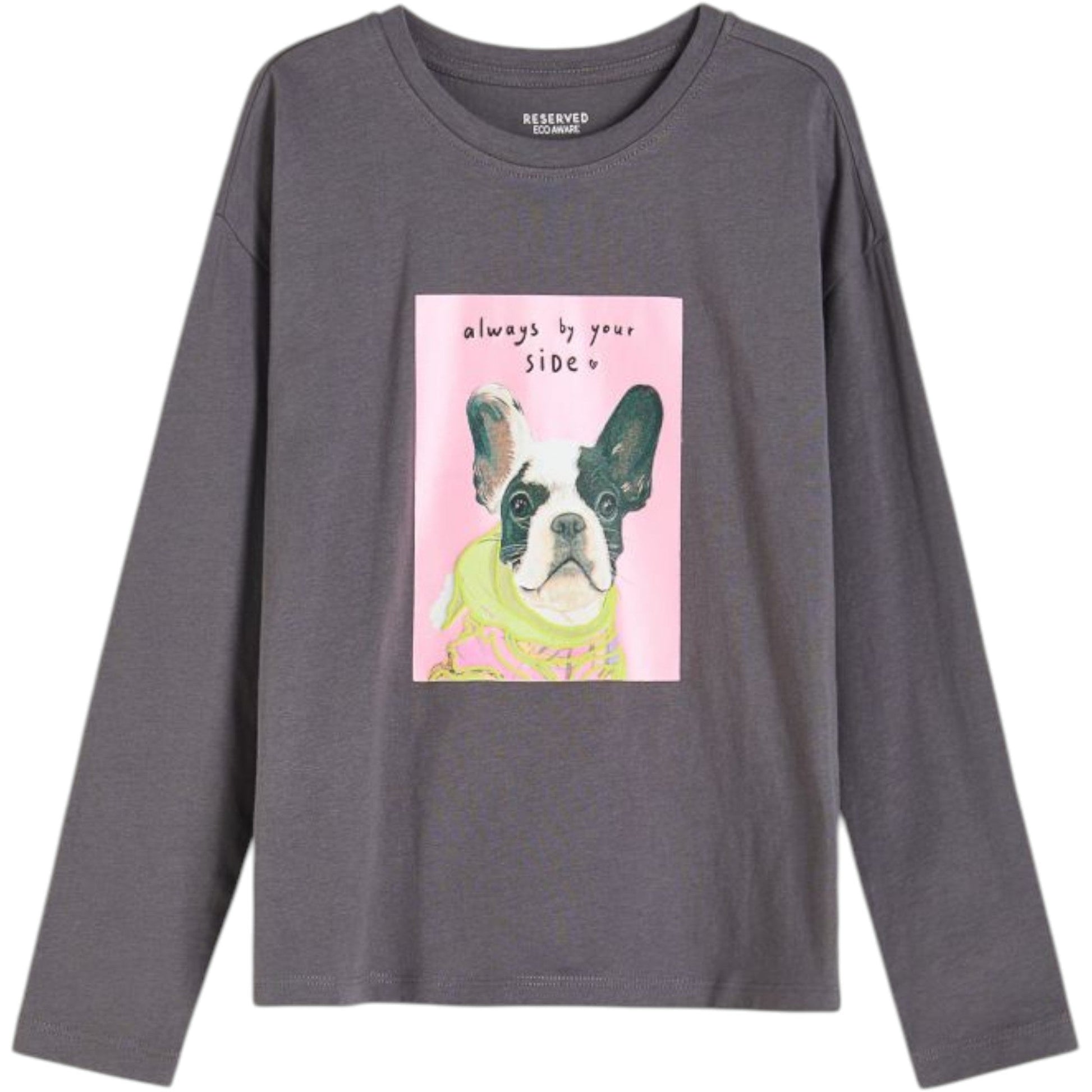 Címke nélküli, szürke, kerek nyakú, hosszú ujjú, elöl téglalap alakú kutyás és "always by your side" (mindig melletted) feliratos mintával
