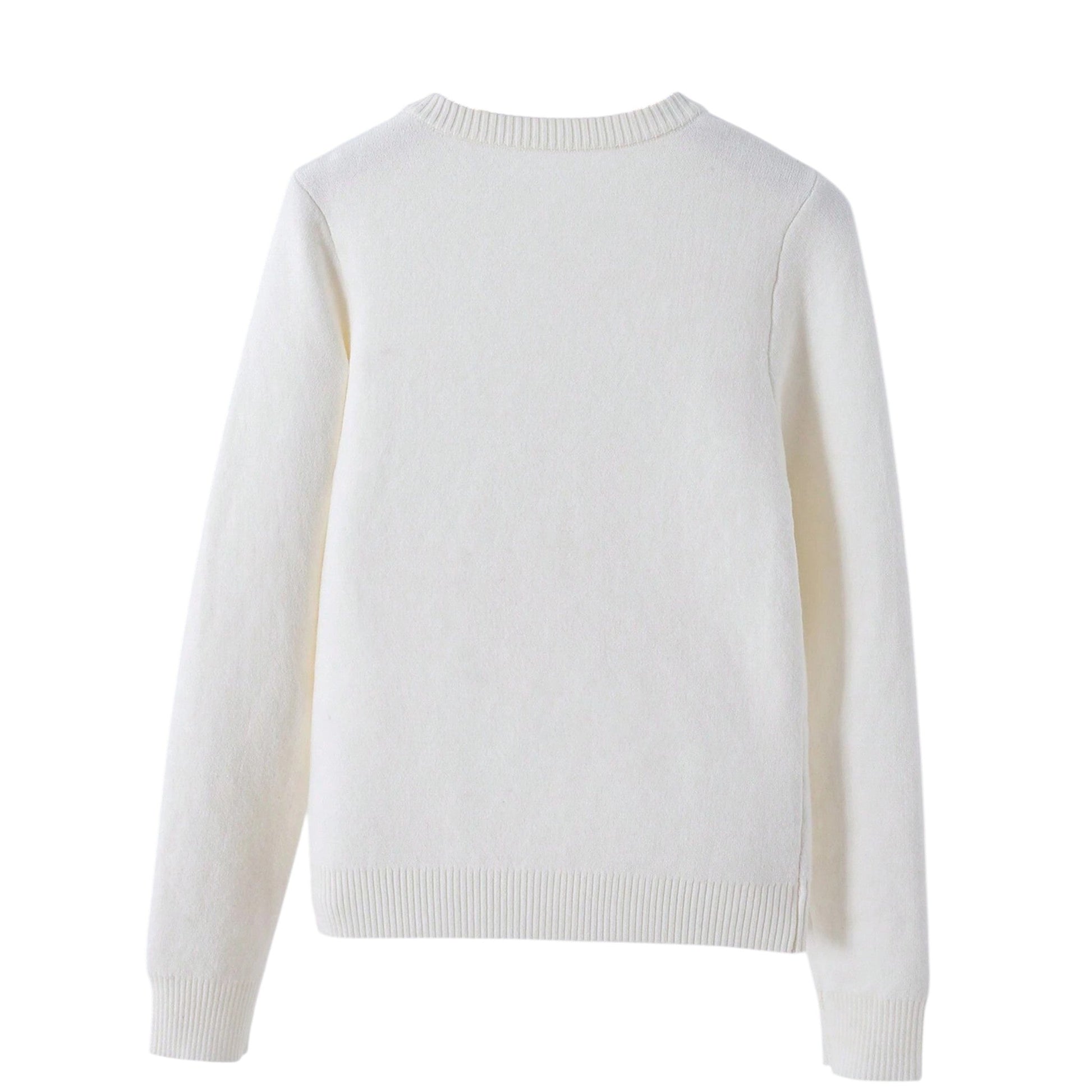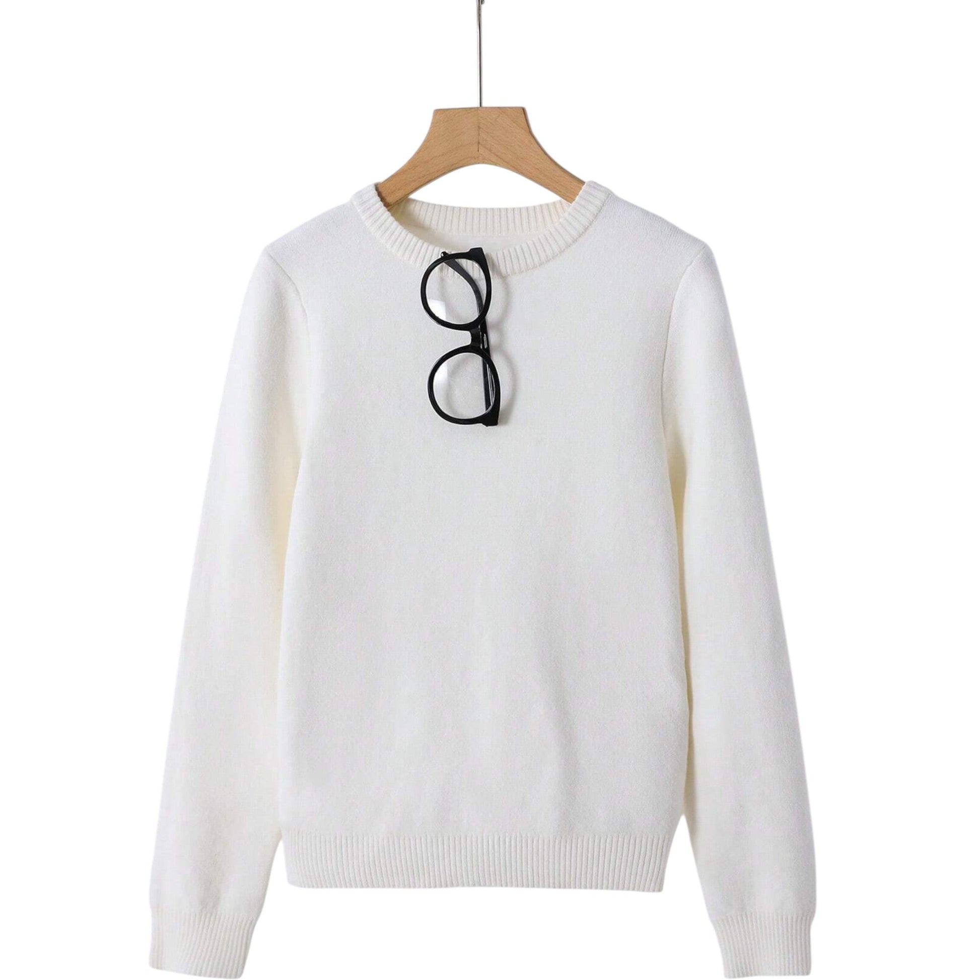 Címke nélküli, fehér, kötött anyagú, hosszú ujjú, kerek nyakú pulóver, bordázott passzéval az ujjvégeken és alján.