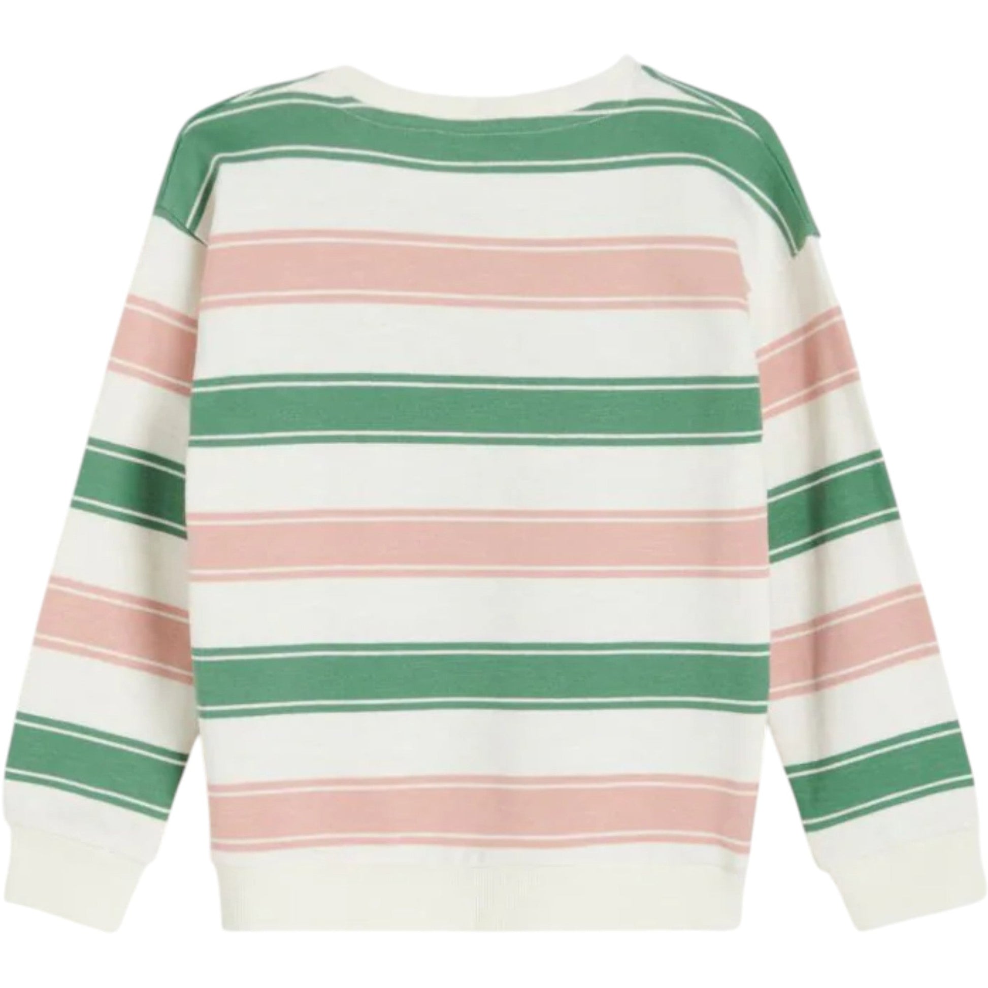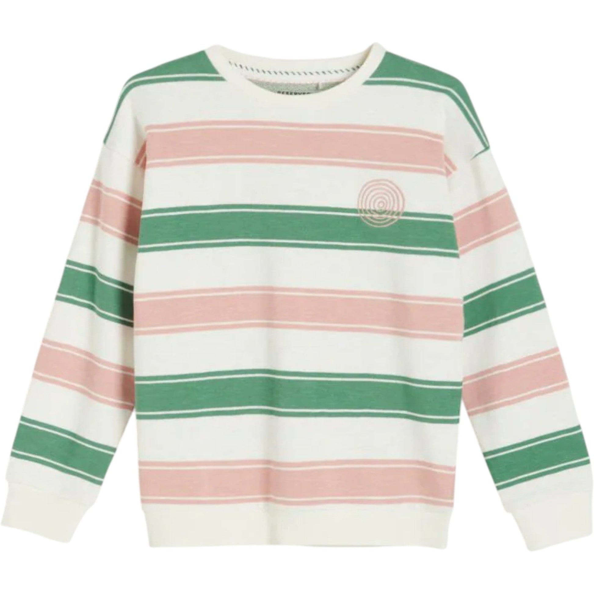Címke nélküli, krémszínű, zöld és rózsaszín csíkokkal, kerek nyakú, hosszú ujjú, elöl hímzett kerek mintával, pulóver fazon