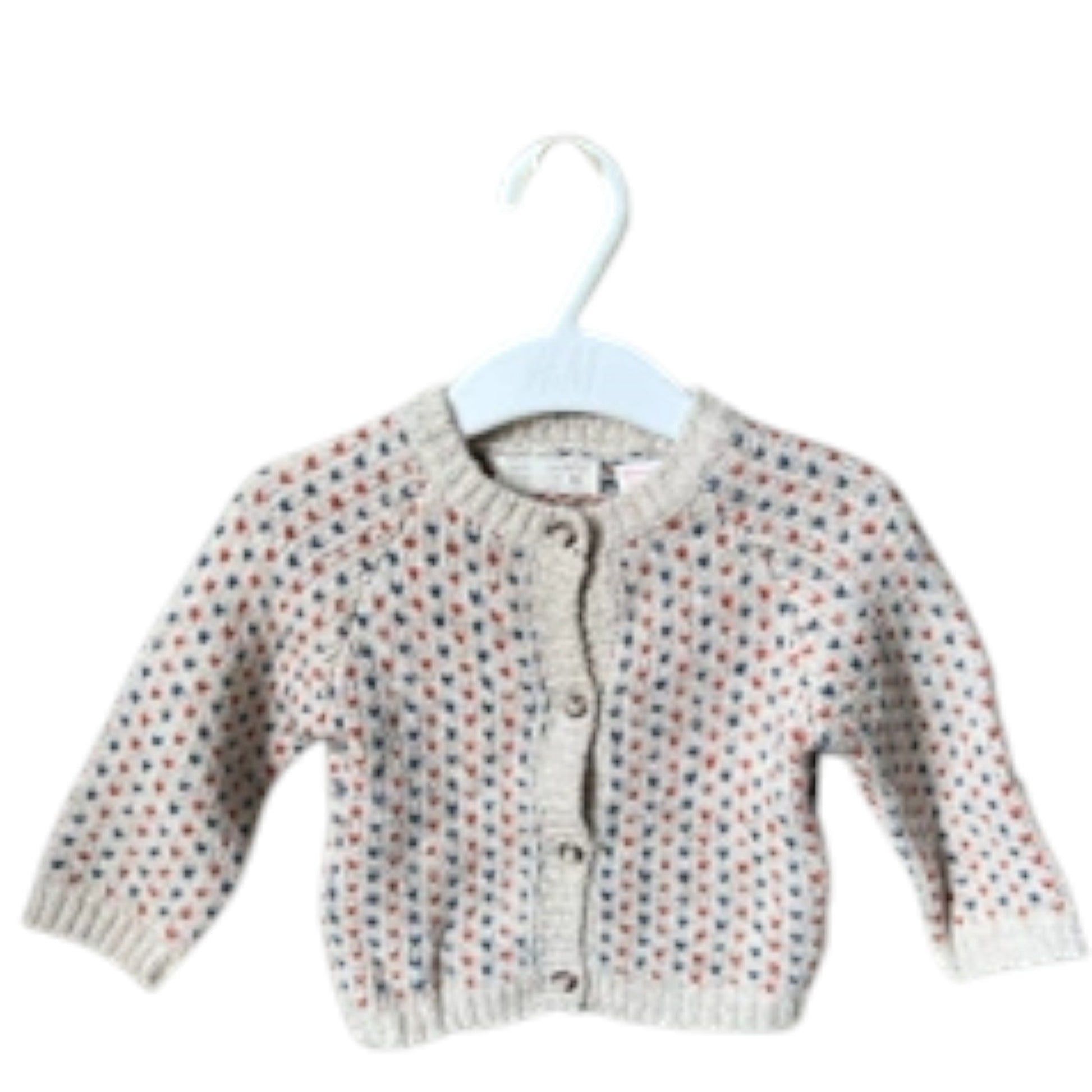 Címke nélküli, bézs, apró piros és sötétkék mintás, kötött, hosszú ujjú kardigán, kerek nyakkal, elöl gombokkal záródó.