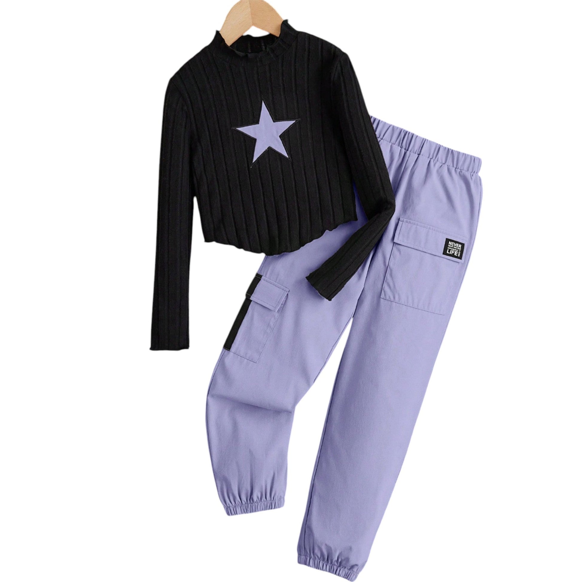 Címke nélküli, fekete bordázott felső és lila cargo nadrág szett.