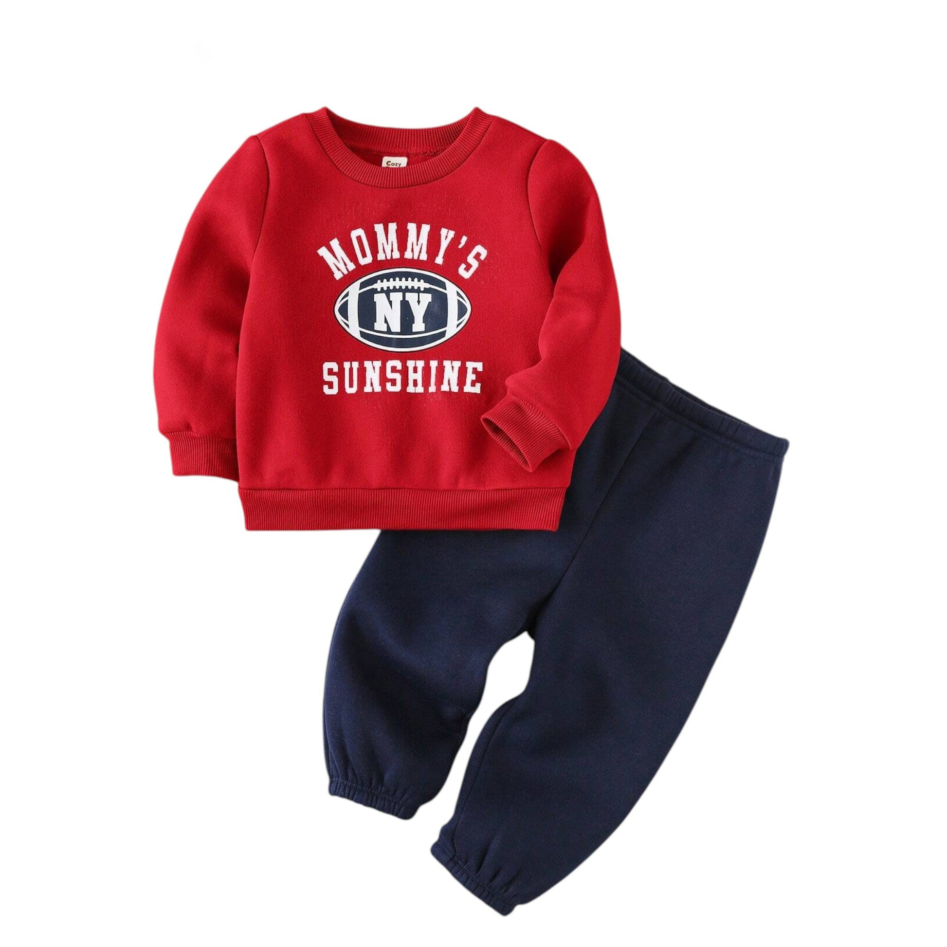 Címke nélküli, piros és sötétkék, hosszú ujjú, nyomtatott pulóver és nadrág szett gyerekeknek.