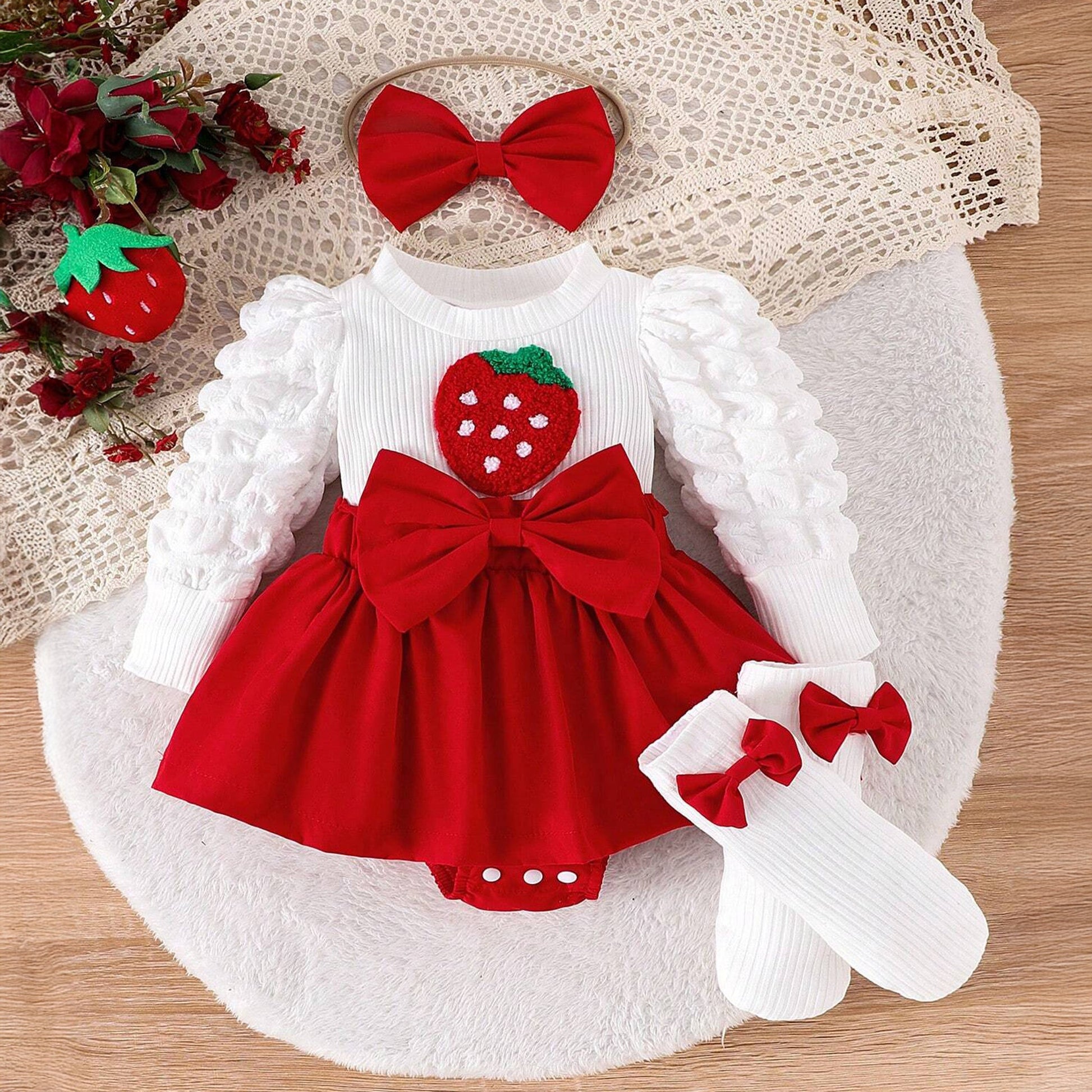 Címke nélküli, piros és fehér, hosszú ujjú, eper mintás ruha, fejpánttal és zoknival.