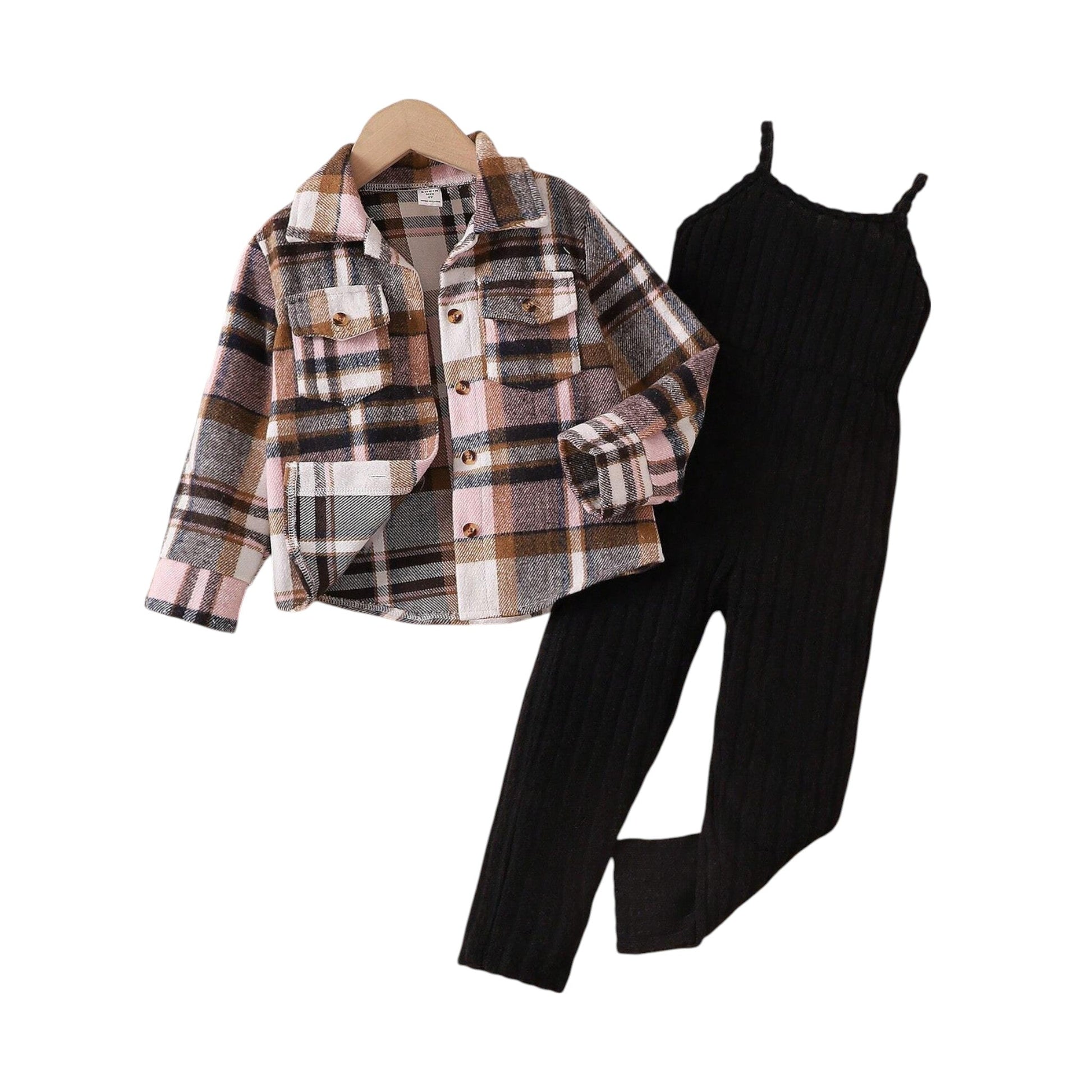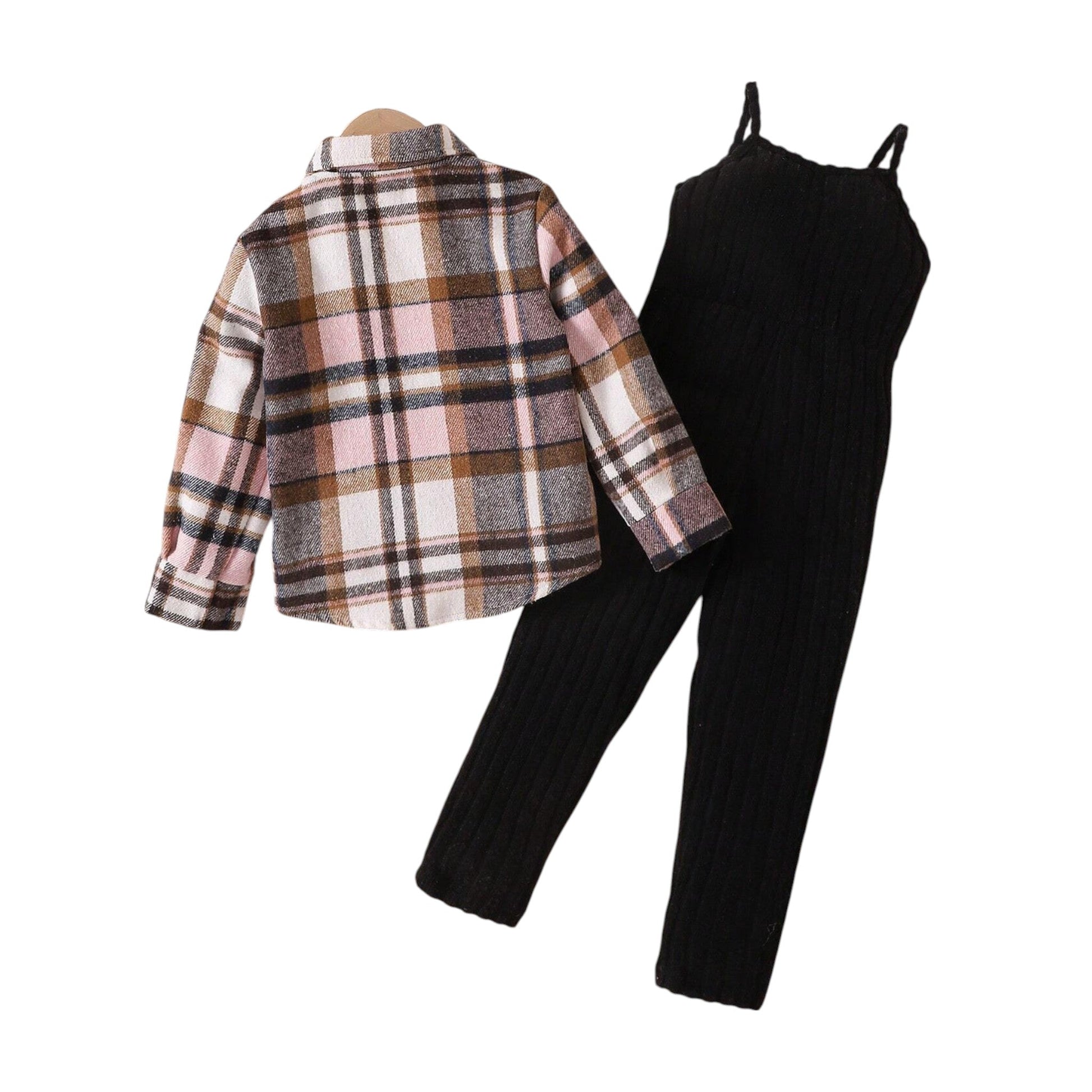 Címke nélküli, kockás mintás, hosszú ujjú ing és fekete színű, bordázott, pántos jumpsuit szett.