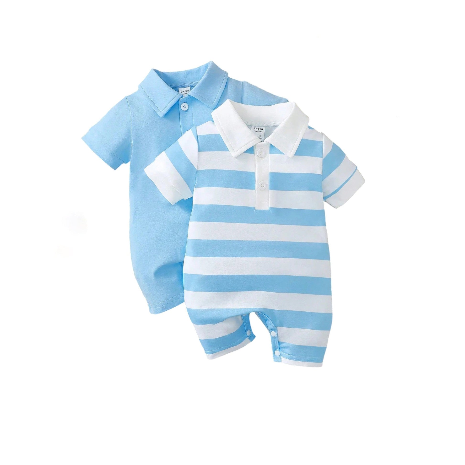 Címke nélküli, kék és fehér csíkos, galléros, rövid ujjú, patentos szett