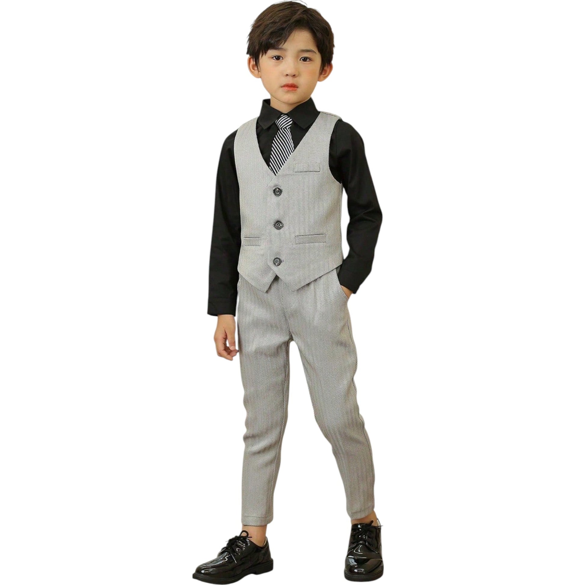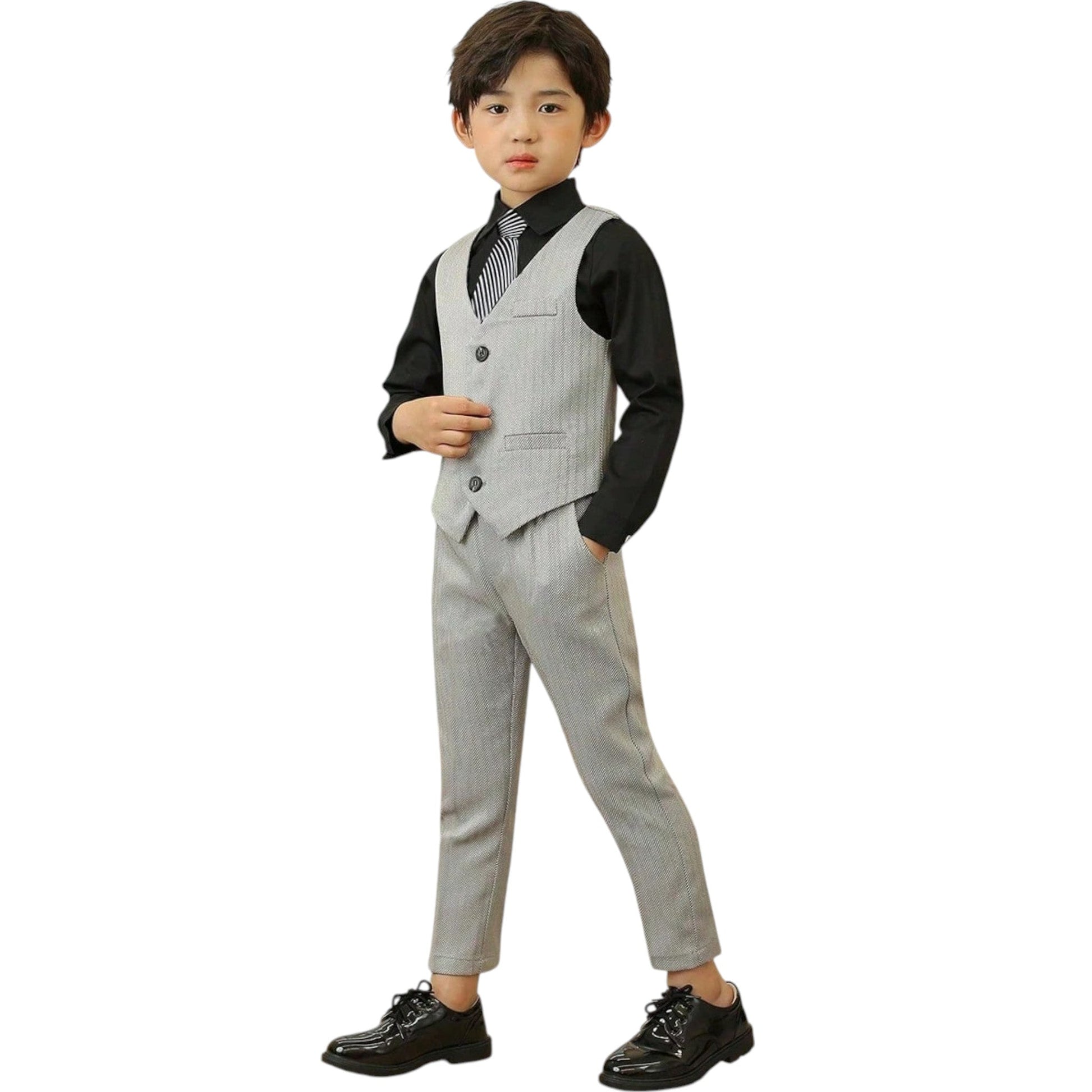 Címke nélküli, szürke színű, slim fit öltöny szett, mellény, nadrág, ing és hozzáillő nyakkendővel.