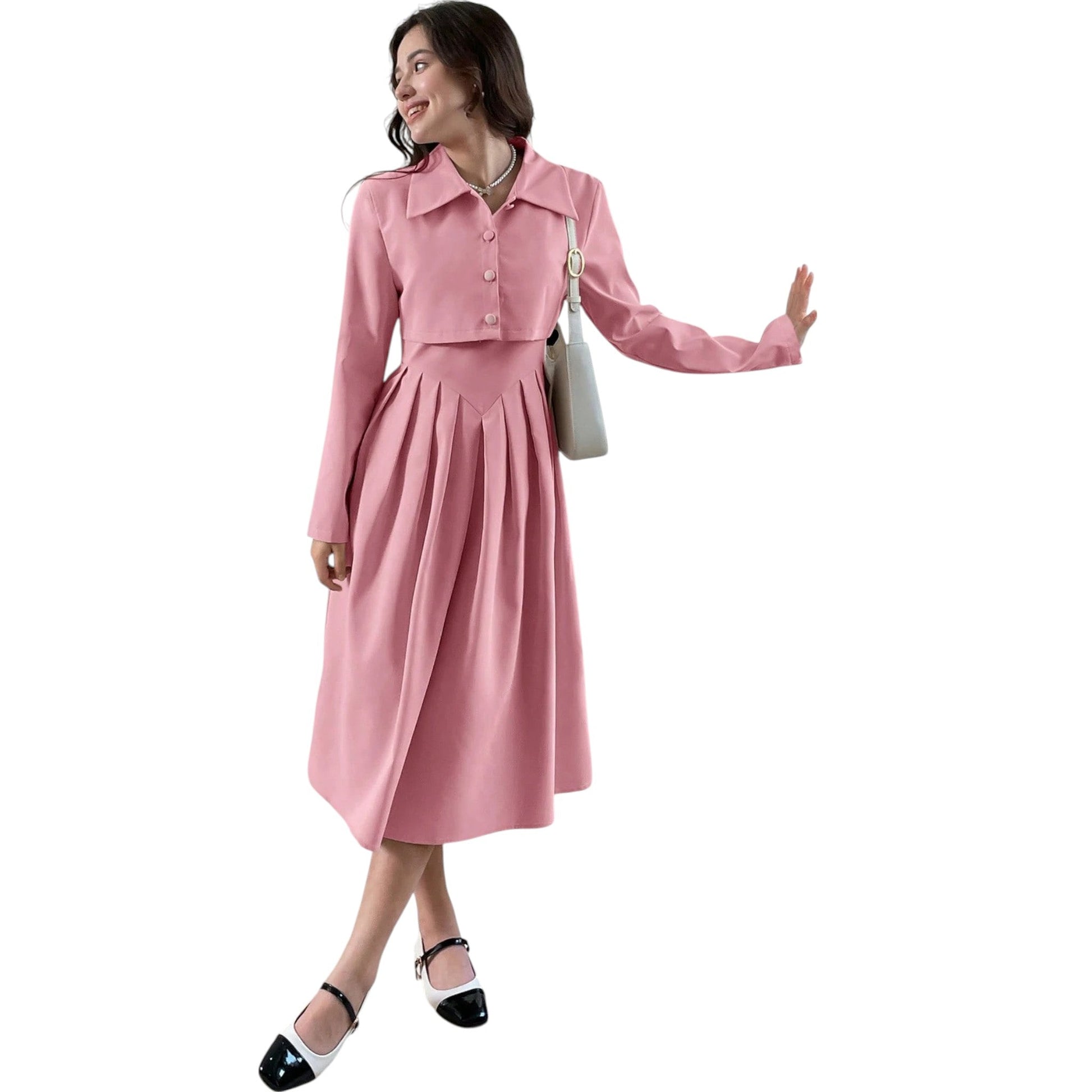 Címke nélküli, rózsaszín, kétrészes, rövid blézer és pliszírozott midi ruha.