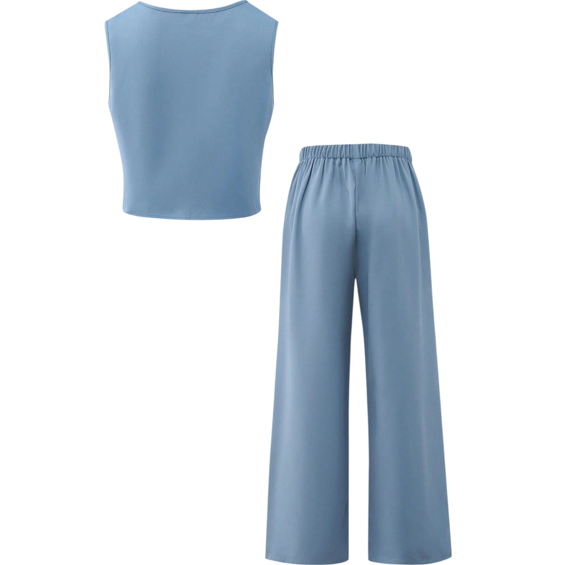 Címke nélküli, világoskék, mellény gombokkal és zsebekkel, széles szárú nadrág magas derékkal.