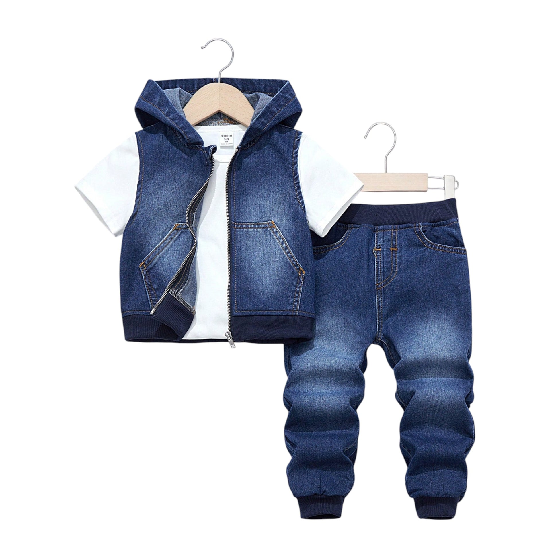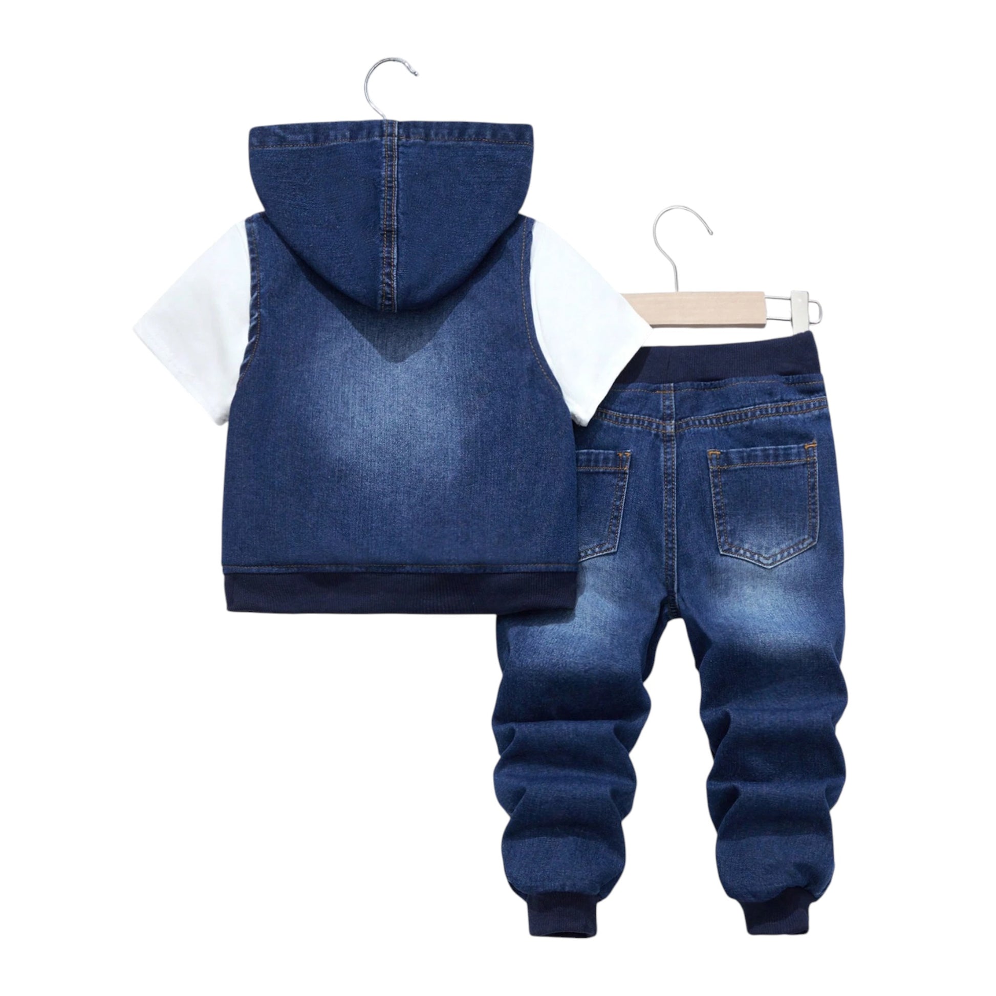Címke nélküli, kék, 3 részes szett, mely tartalmaz egy fehér rövid ujjú pólót, egy kapucnis, ujjatlan farmer mellényt és egy passzés szárú farmer nadrágot.