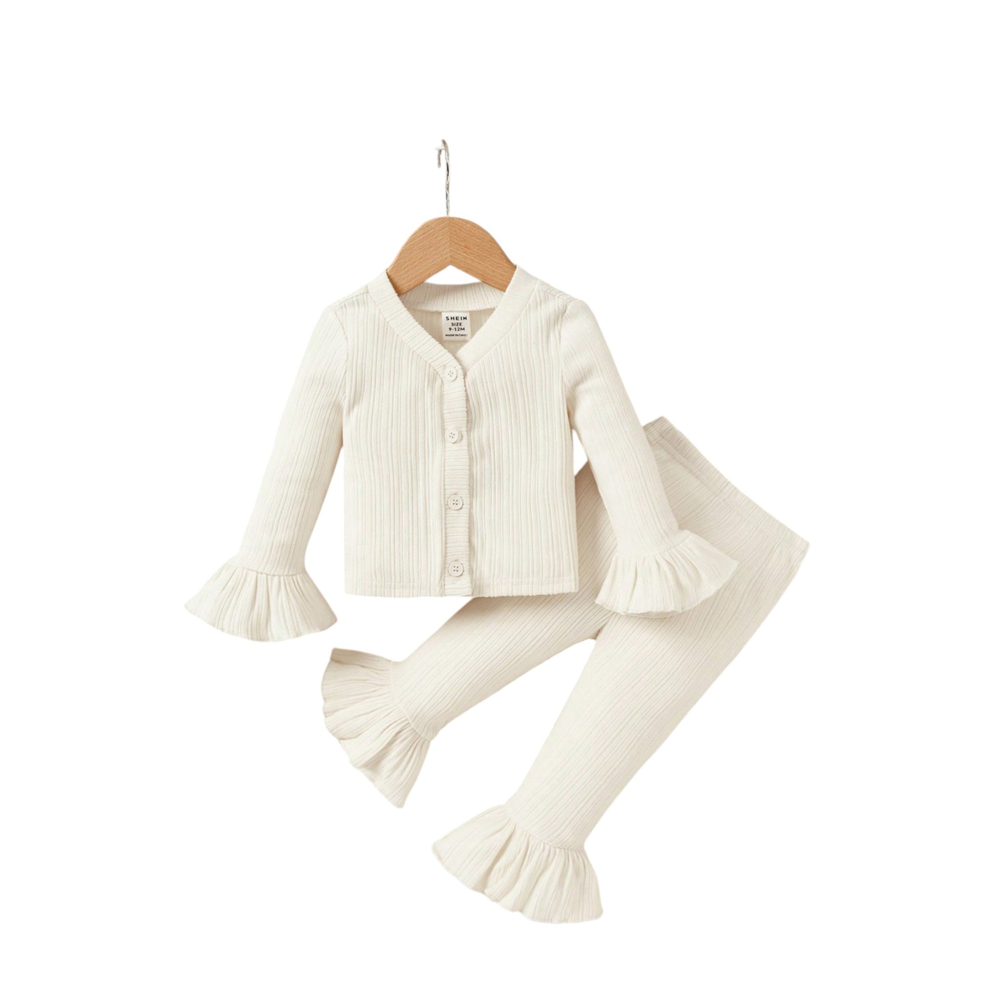Címke nélküli, bézs, kötött, a felső V-nyakú, gombos, hosszú ujjú, a nadrág gumis derekú, mindkét darab ujja és lábszára alján fodros.