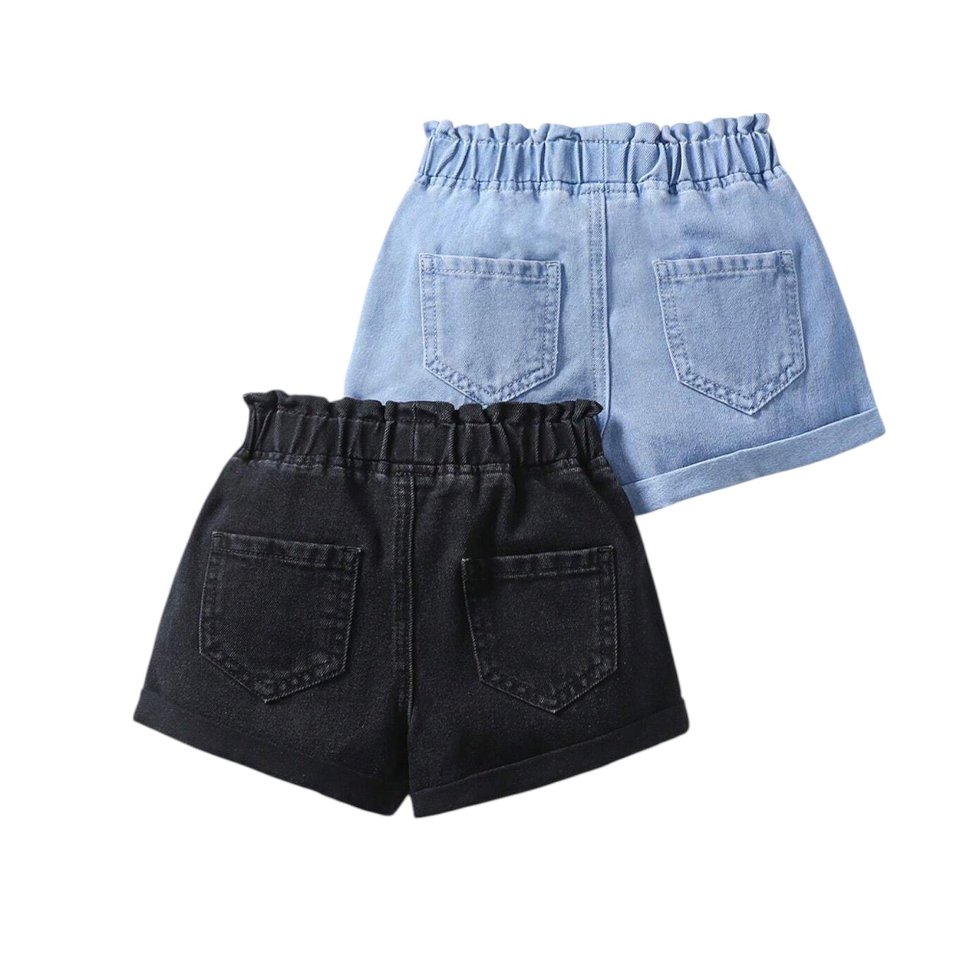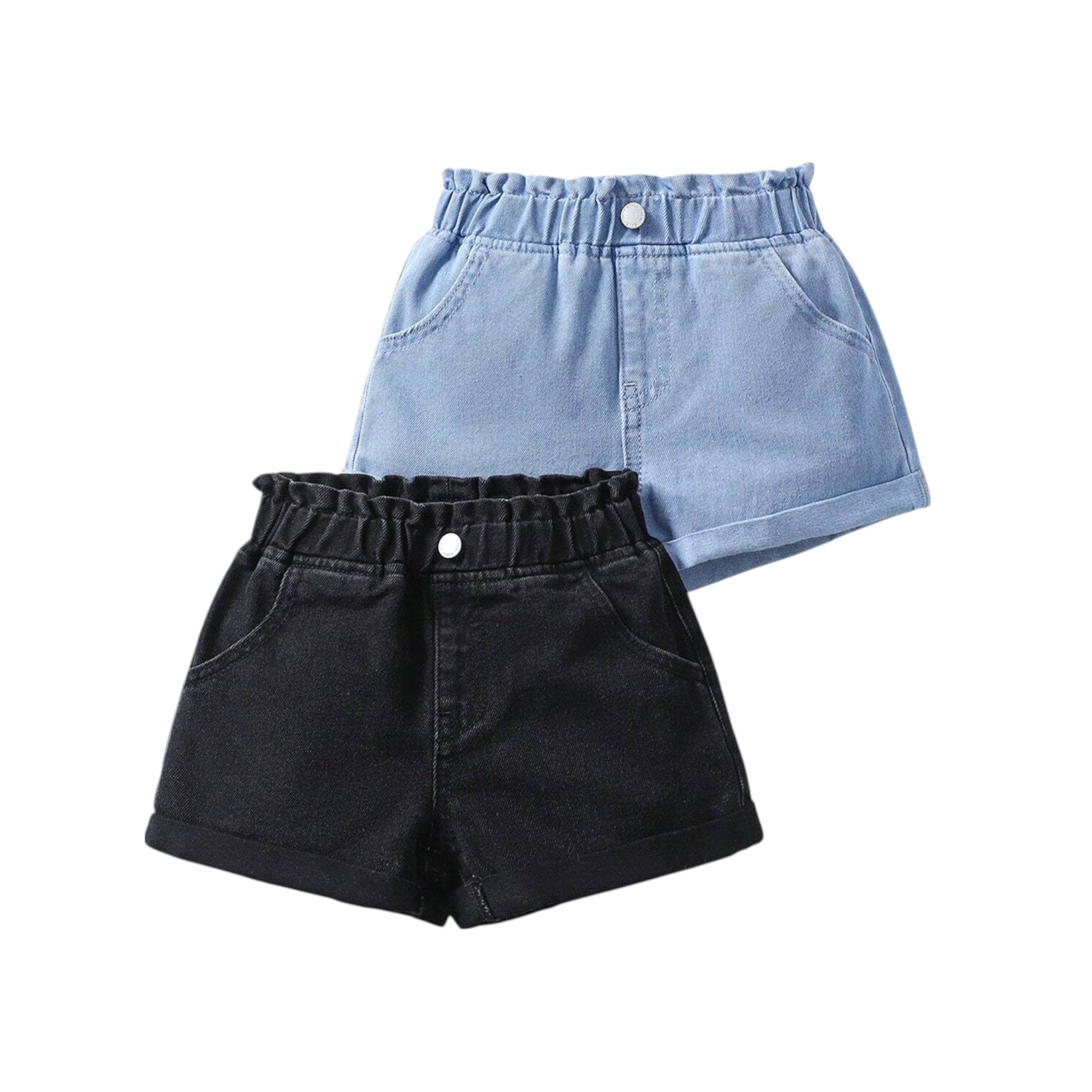 Címke nélküli, fekete és világoskék, magas derekú, fodros derekú, farmer rövidnadrág, 2 darabos szett.
