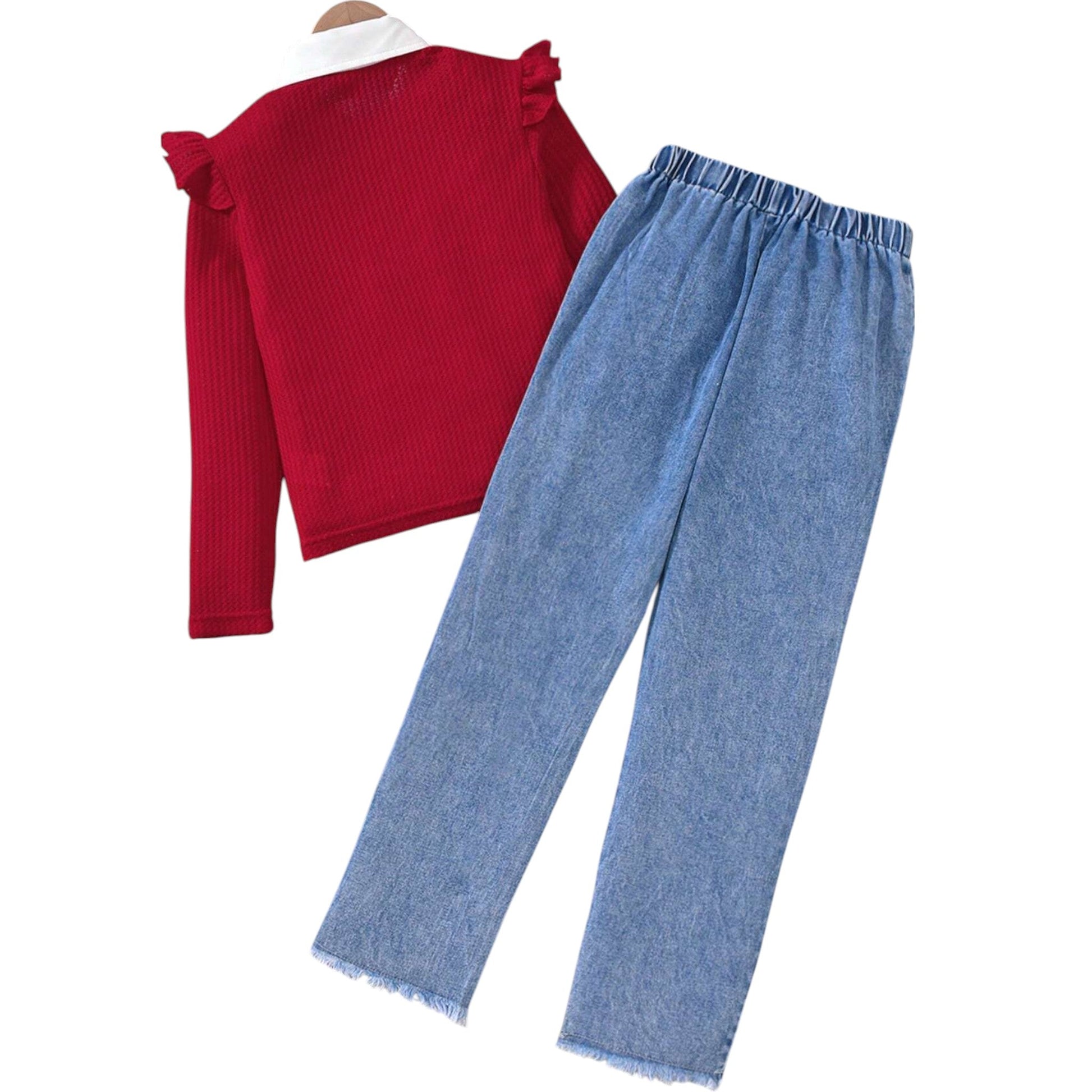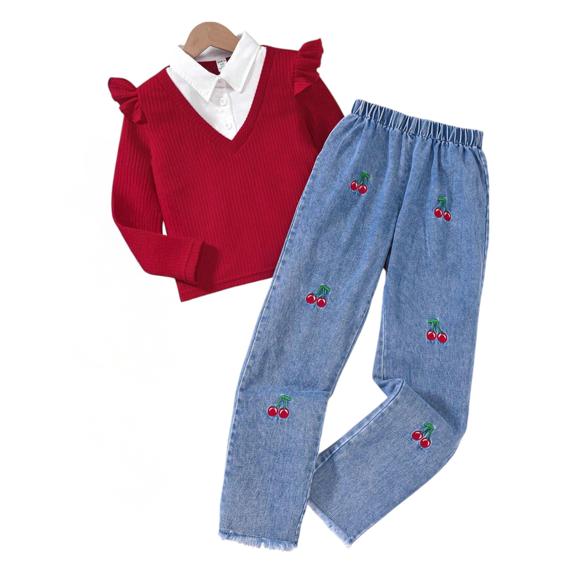 Címke nélküli, piros kötött V-nyakú felső fehér inggallérral és kék cseresznye hímzéses farmer nadrág szett.