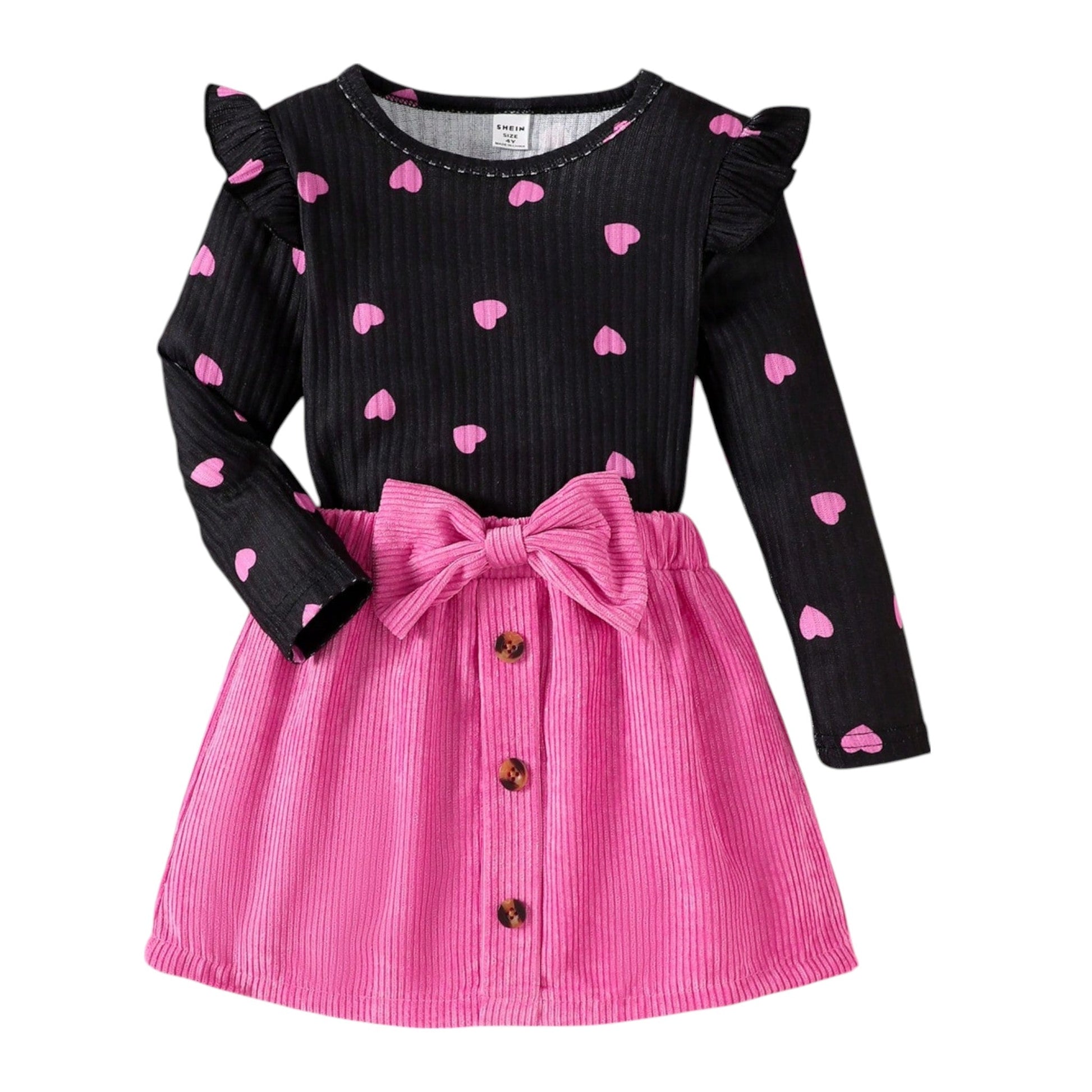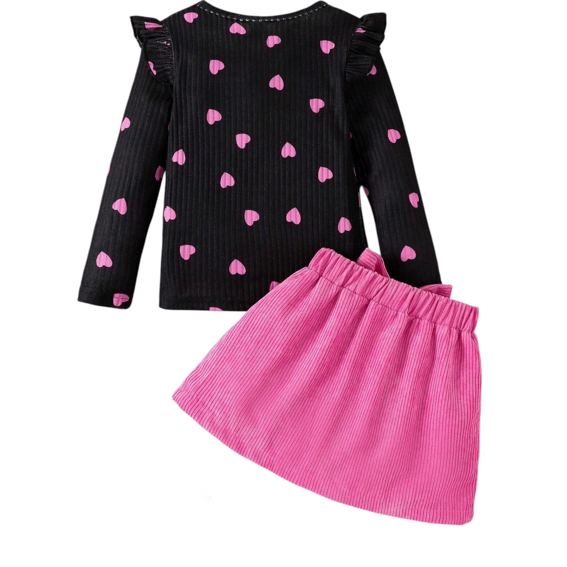Címke nélküli, fekete alapon rózsaszín szív mintás felső, fodros vállú, és rózsaszín bordázott szoknya gombokkal és masnival.