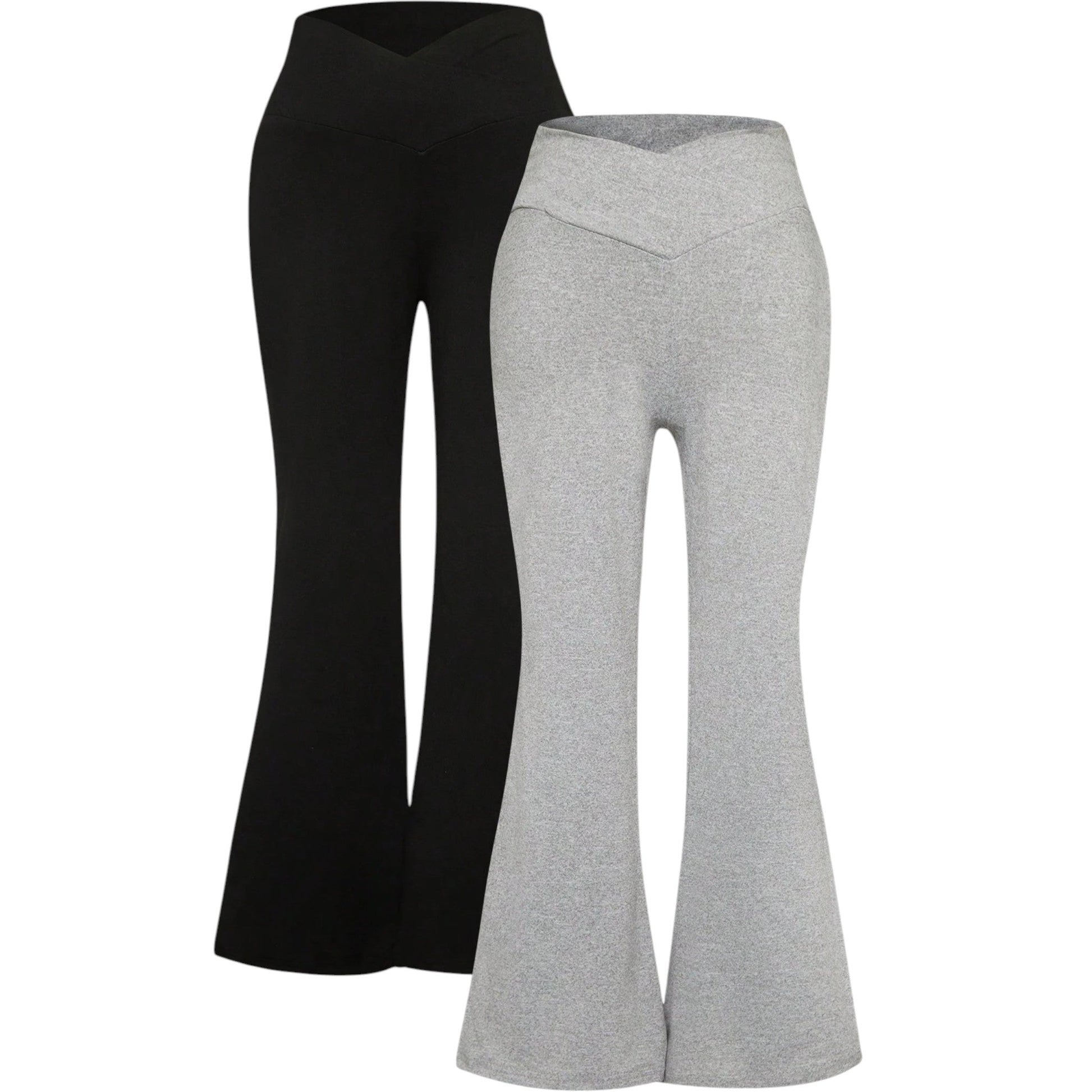 Címke nélküli, fekete és szürke, magas derekú, V-alakú derékpánttal, bővülő szárú leggings.