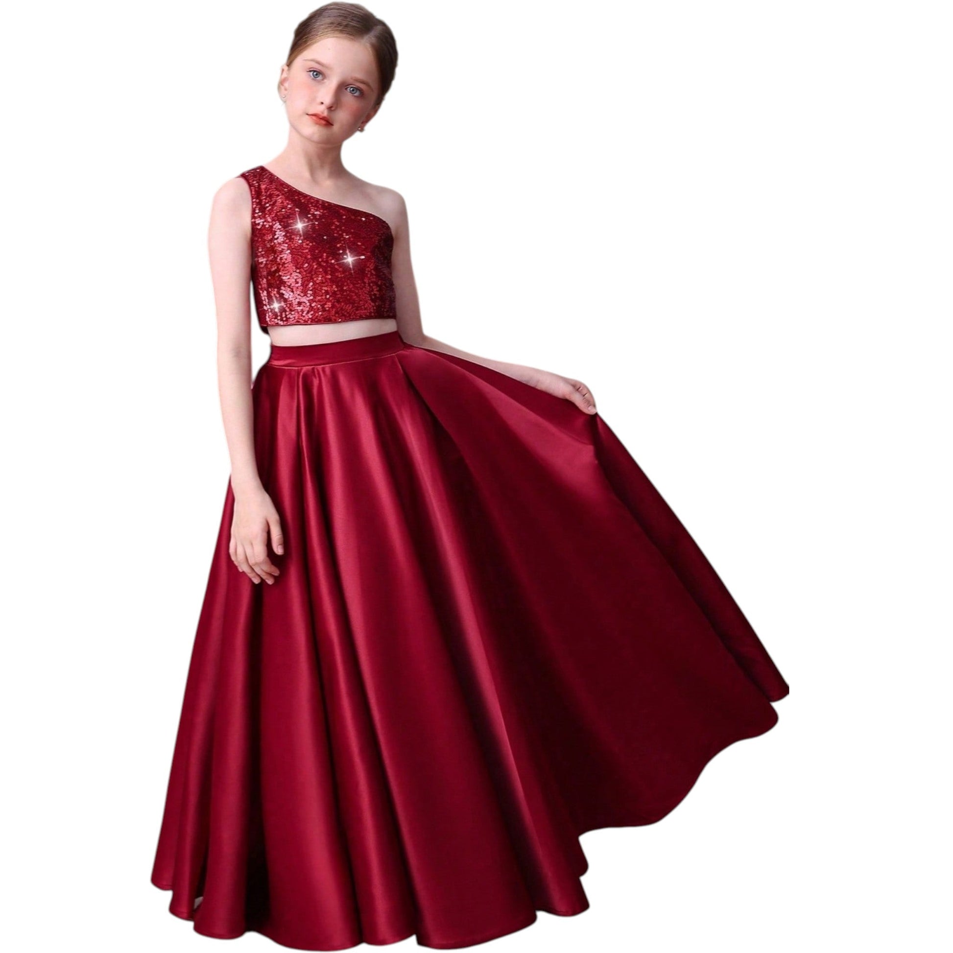 Címke nélküli, bordó, flitteres, félvállas crop felső és hozzáillő bordó, hosszú, bő maxi szoknya.