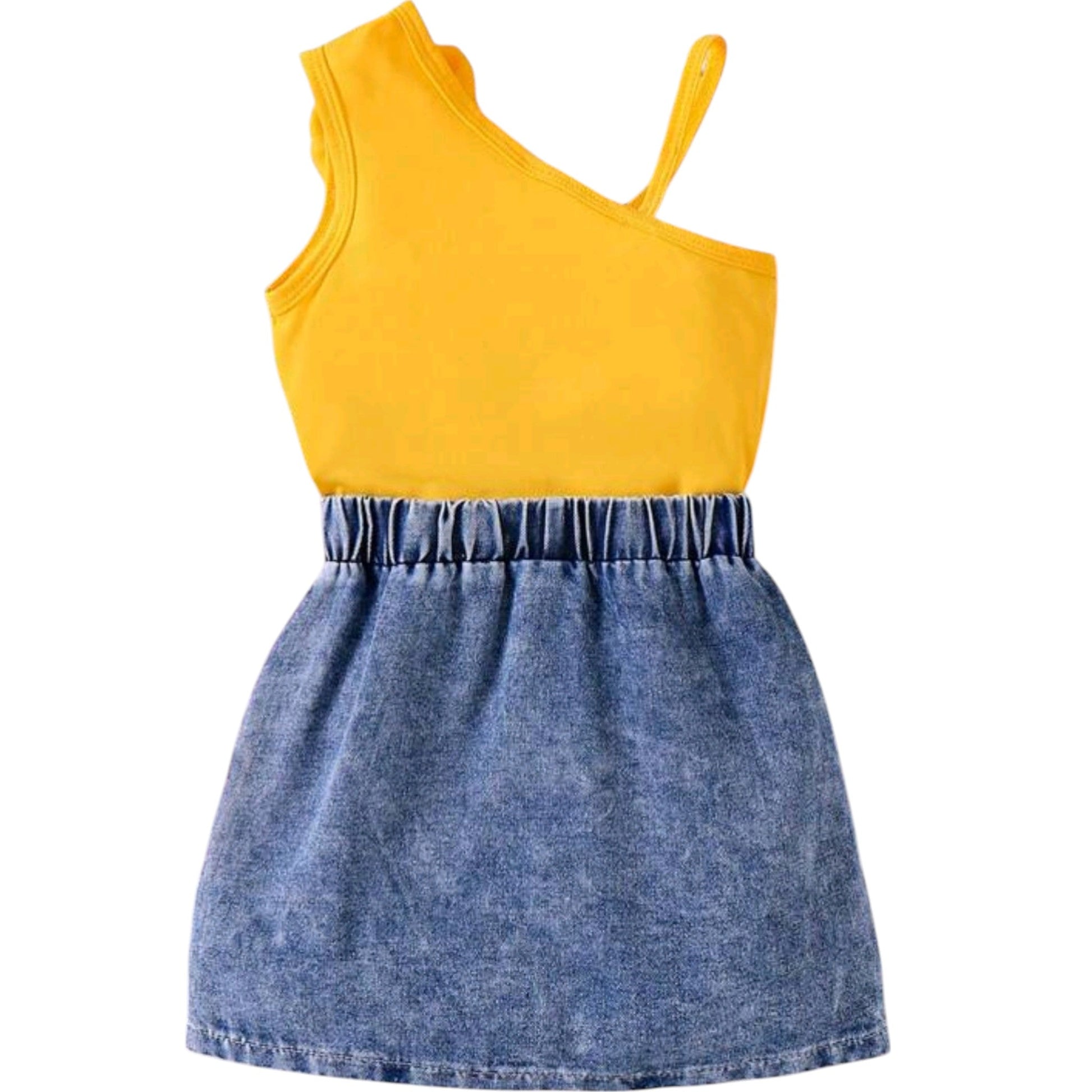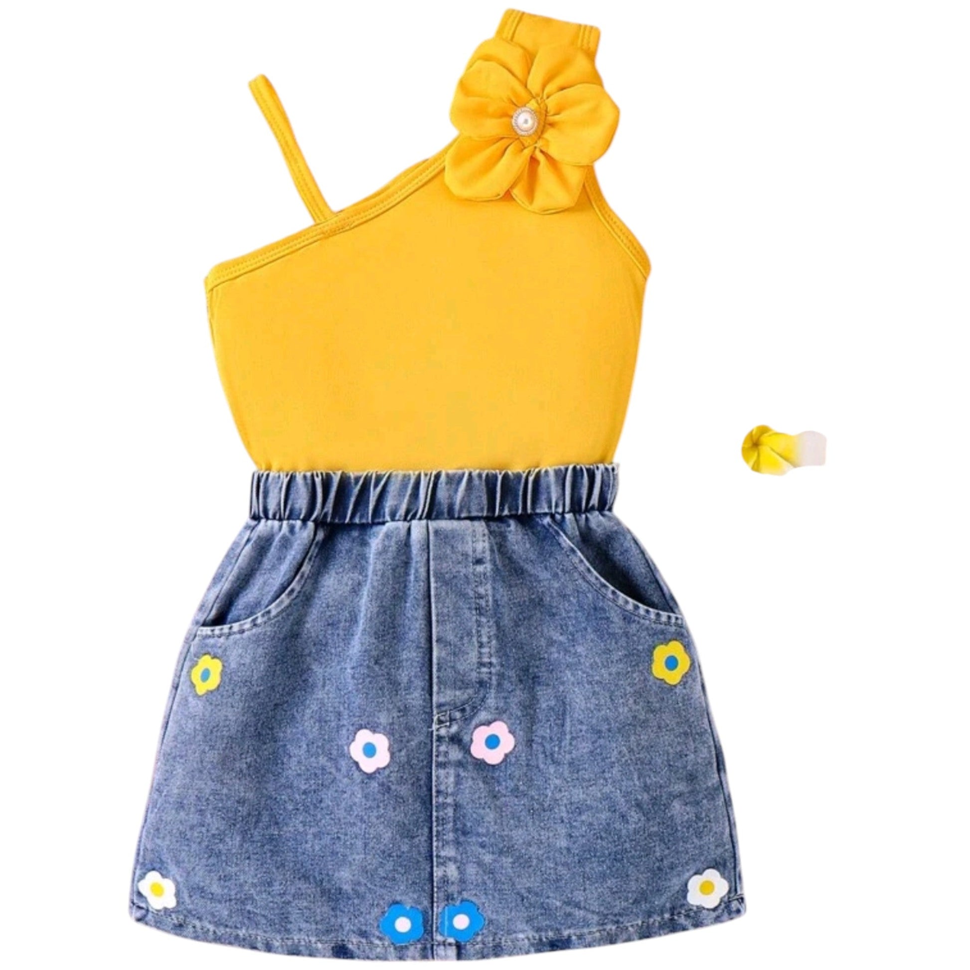 Címke nélküli, sárga, virág díszítésű, asszimetrikus vállú top, kék farmer szoknyával, gumírozott derékkal és hímzett virágokkal.
