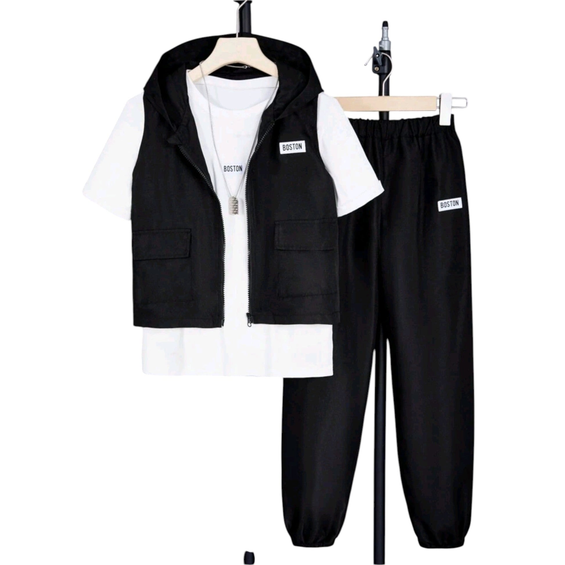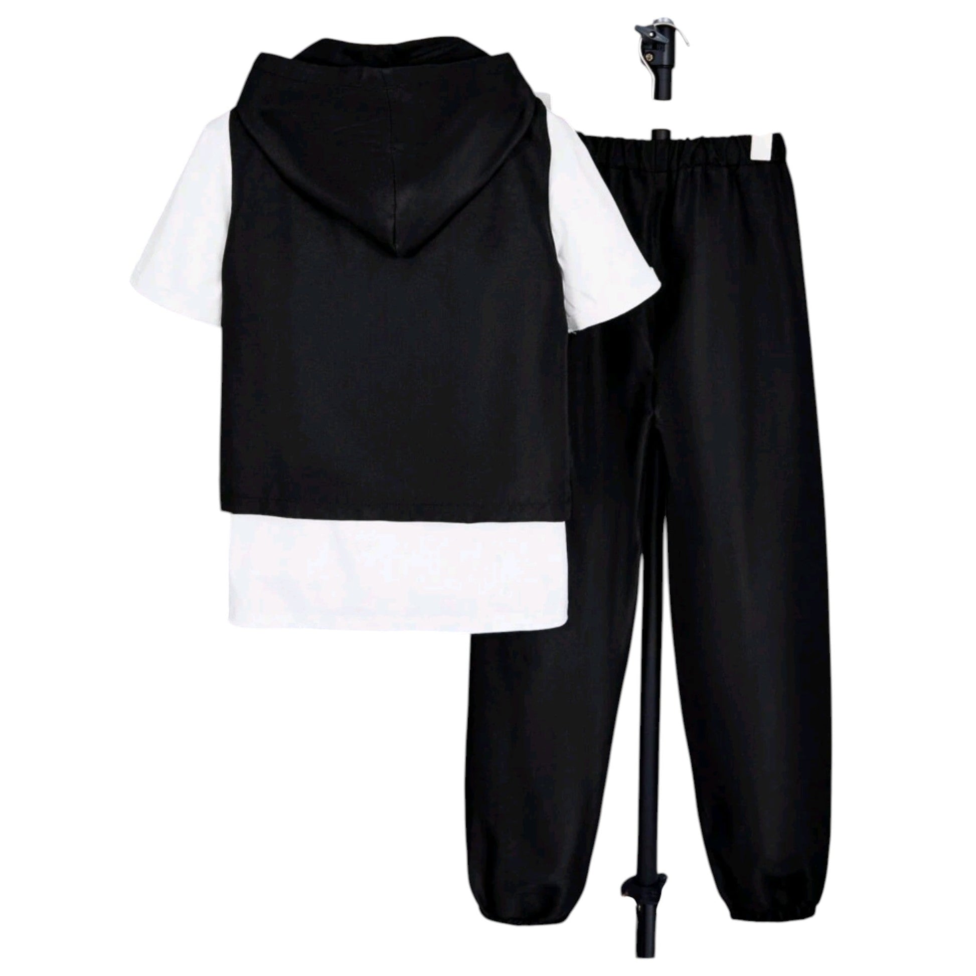Címke nélküli, fekete kapucnis mellény és fekete nadrág szett.