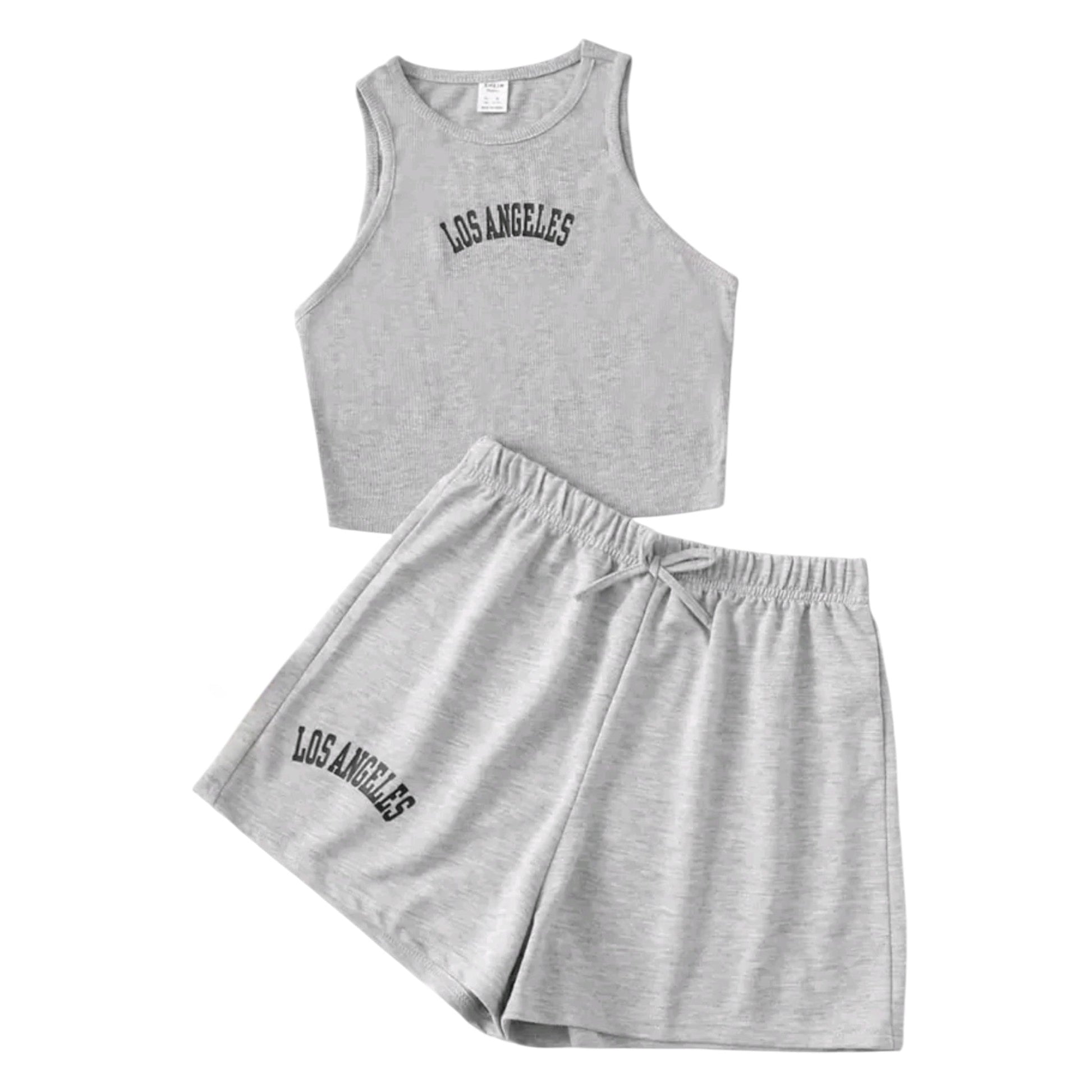 Címke nélküli, szürke színű, bordázott anyagú, "Los Angeles" feliratos crop top és hozzáillő rövidnadrág szett.