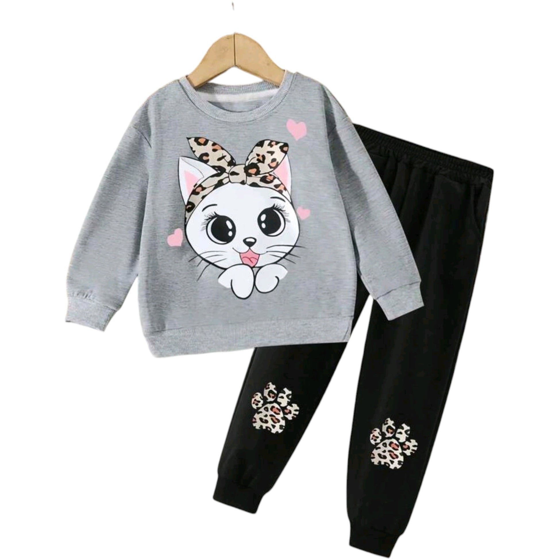 Címke nélküli, szürke/fekete, hosszú ujjú, kerek nyakú pulóver, nagy cicafej mintával és szívecskékkel az elején, passzés fekete tréningnadrággal, melynek szárán folt hatású leopárd mintás díszítés található, szettben.