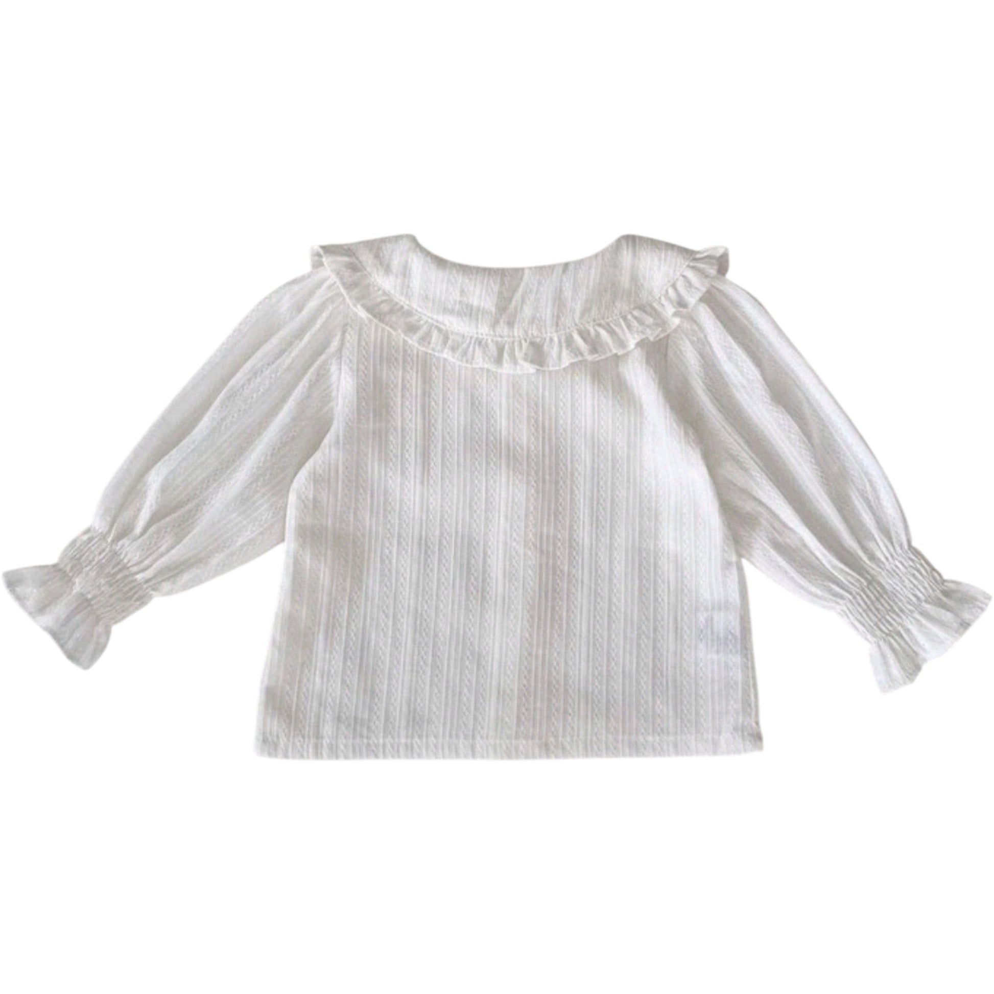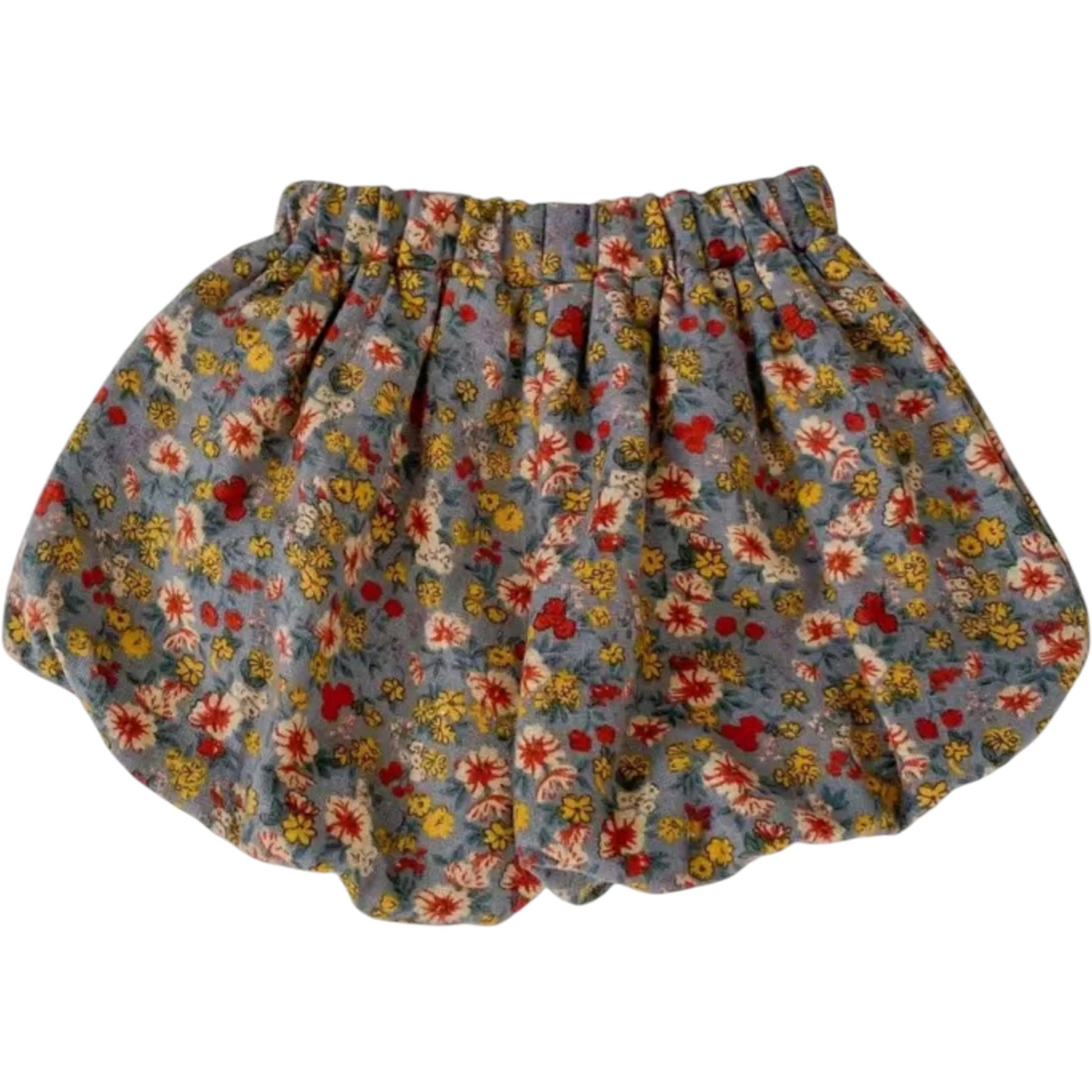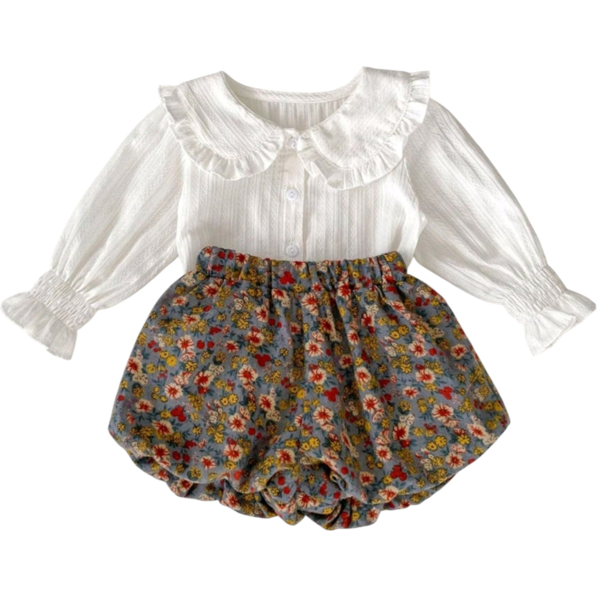 Címke nélküli. Blúz: fehér, hosszú, ráncolt ujjú, fodros galléros, gumírozott ujjvégekkel, elől gombokkal. Szoknya/Nadrág: szürke, virágmintás, gumírozott derekú, buborék fazonú rövid nadrág/szoknya.
