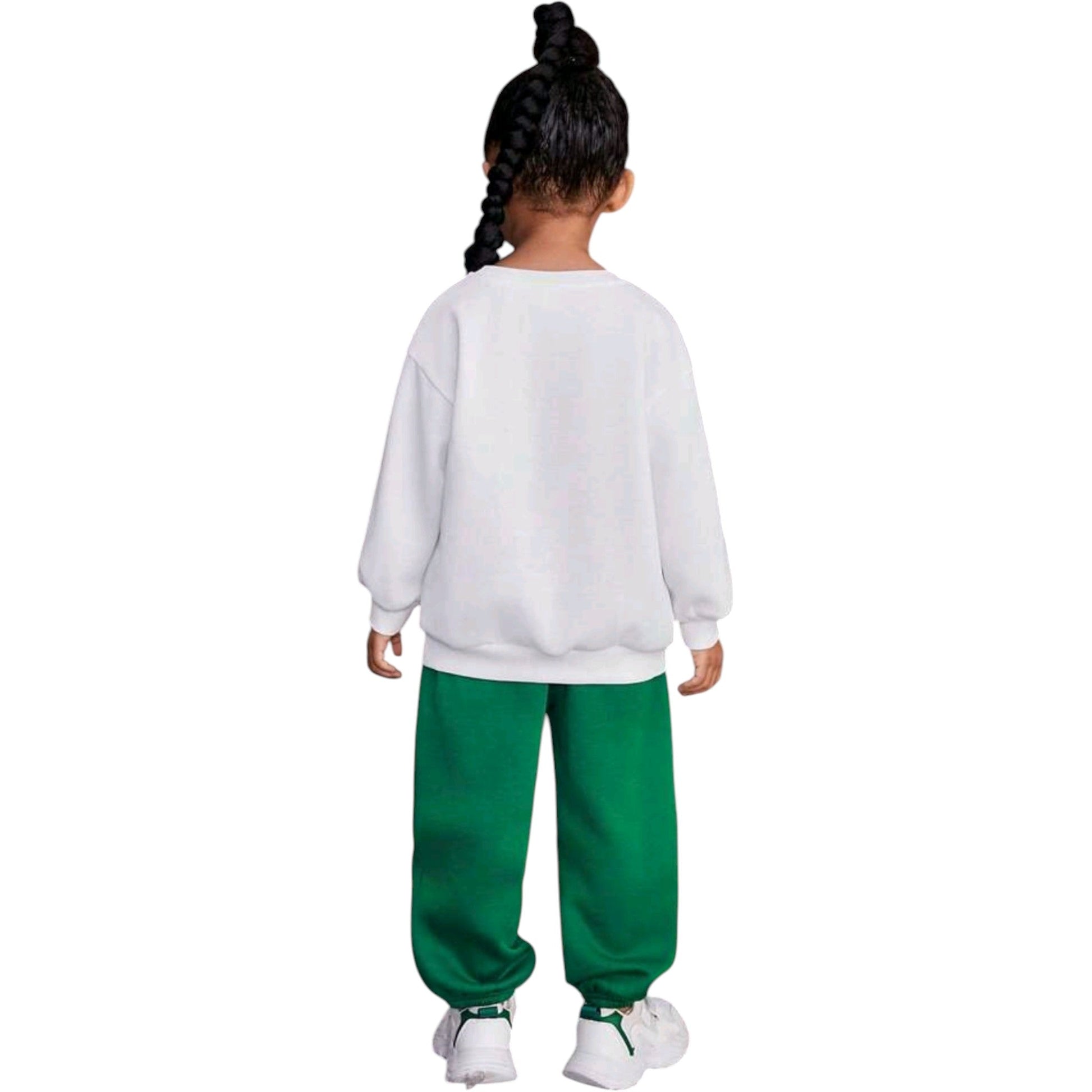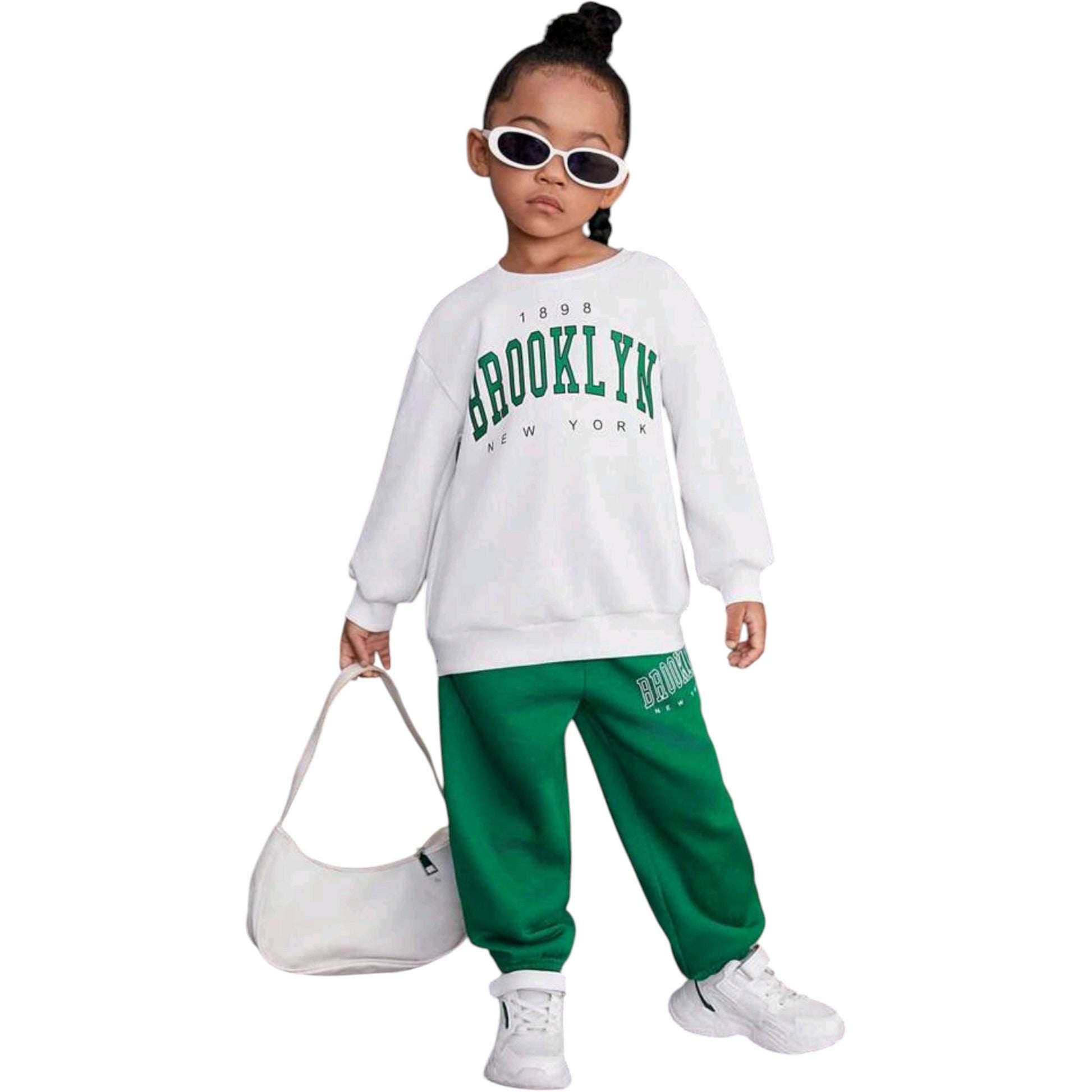 Címke nélküli. Pulóver: fehér, hosszú ujjú, kerek nyakú, bordázott passzés szegéllyel és ujjvégekkel, az elején zöld "BROOKLYN" felirattal. Nadrág: zöld, gumis derekú, passzés szegélyű, az elején szintén feliratos mintával.