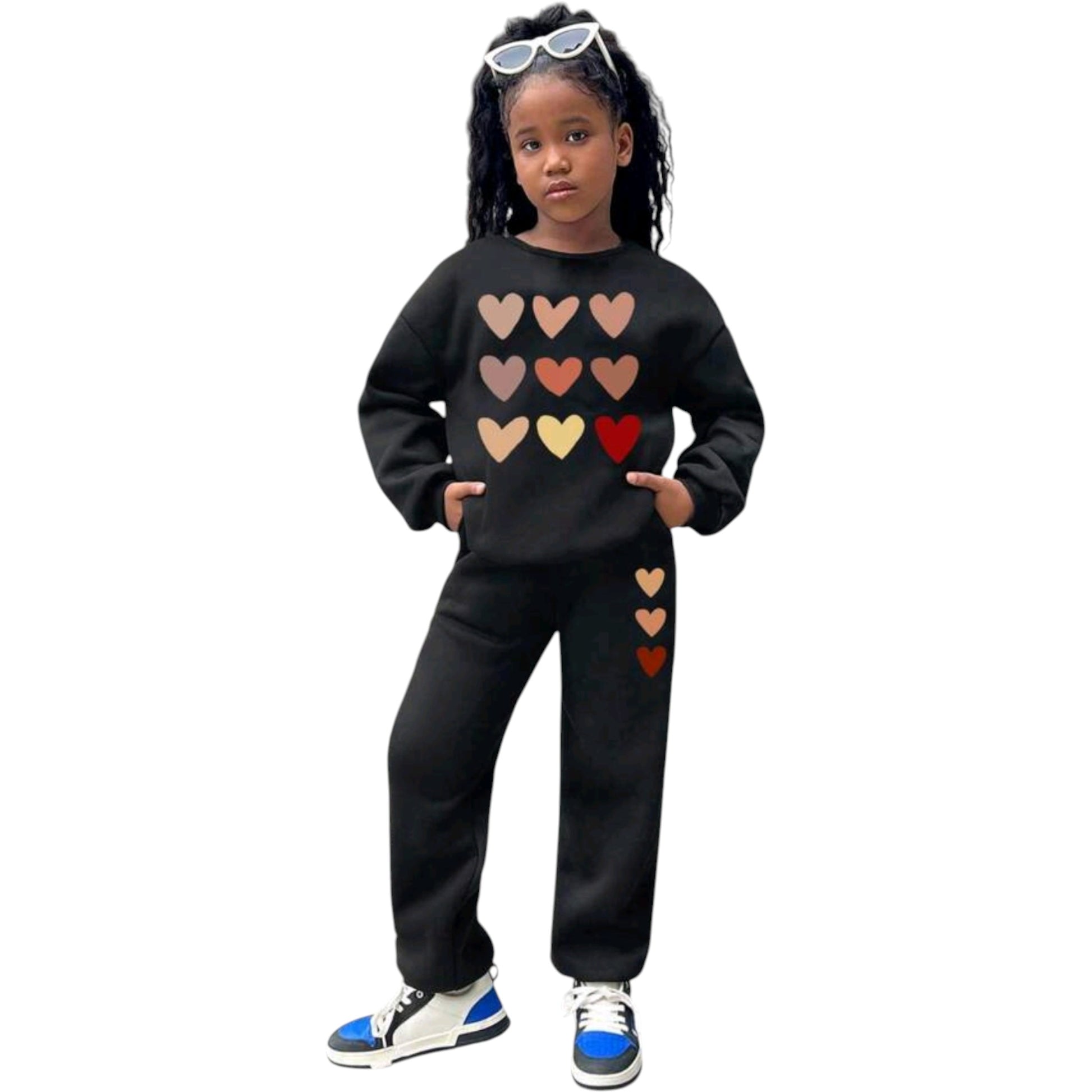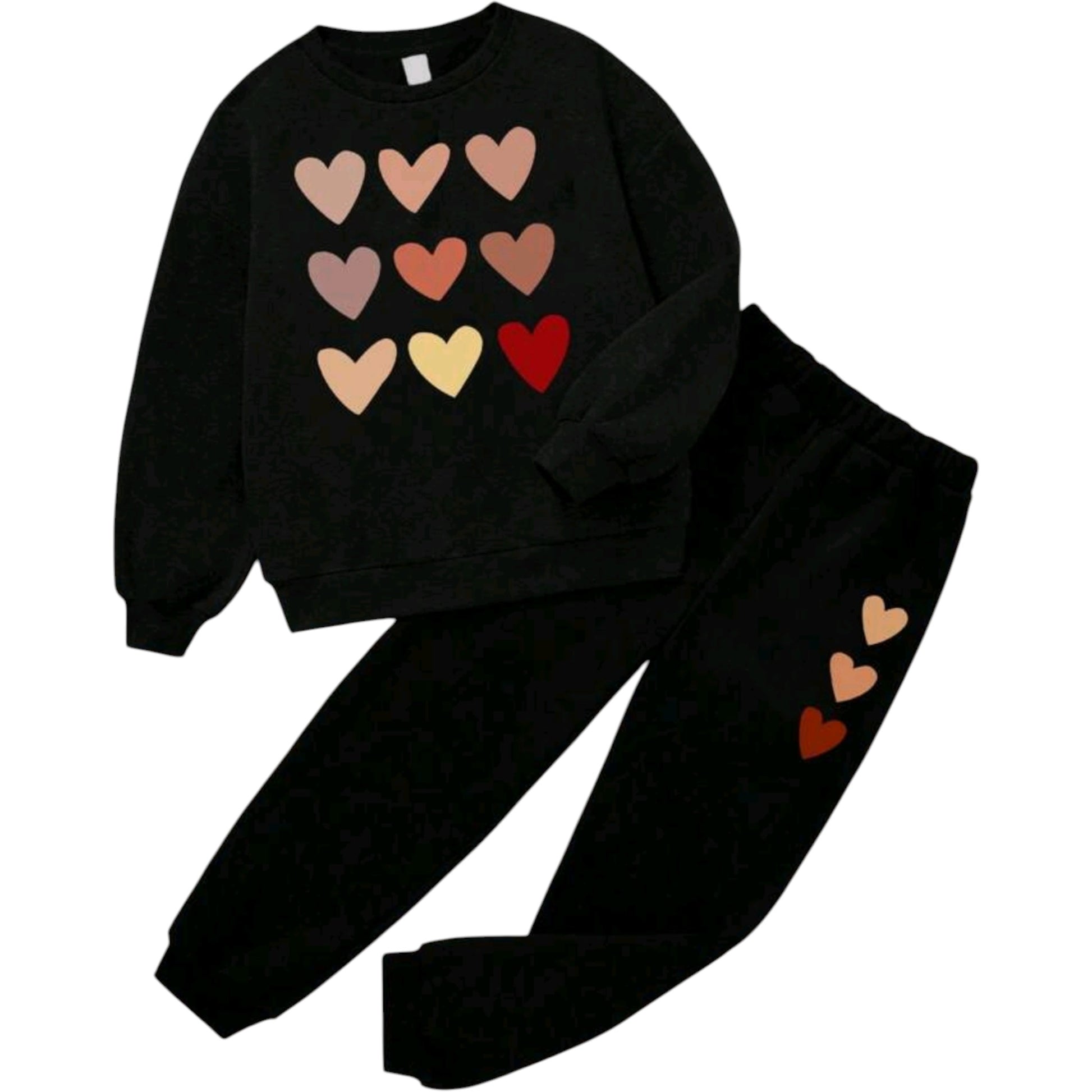 Címke nélküli, fekete szabadidő szett, többszínű szívmintával. Pulóver: hosszú ujjú, kerek nyakú, bordázott passzés szegéllyel és ujjvégekkel, az elején 9 szív mintával. Nadrág: gumis derekú, passzés szegélyű, a bal száron 3 szív mintával.