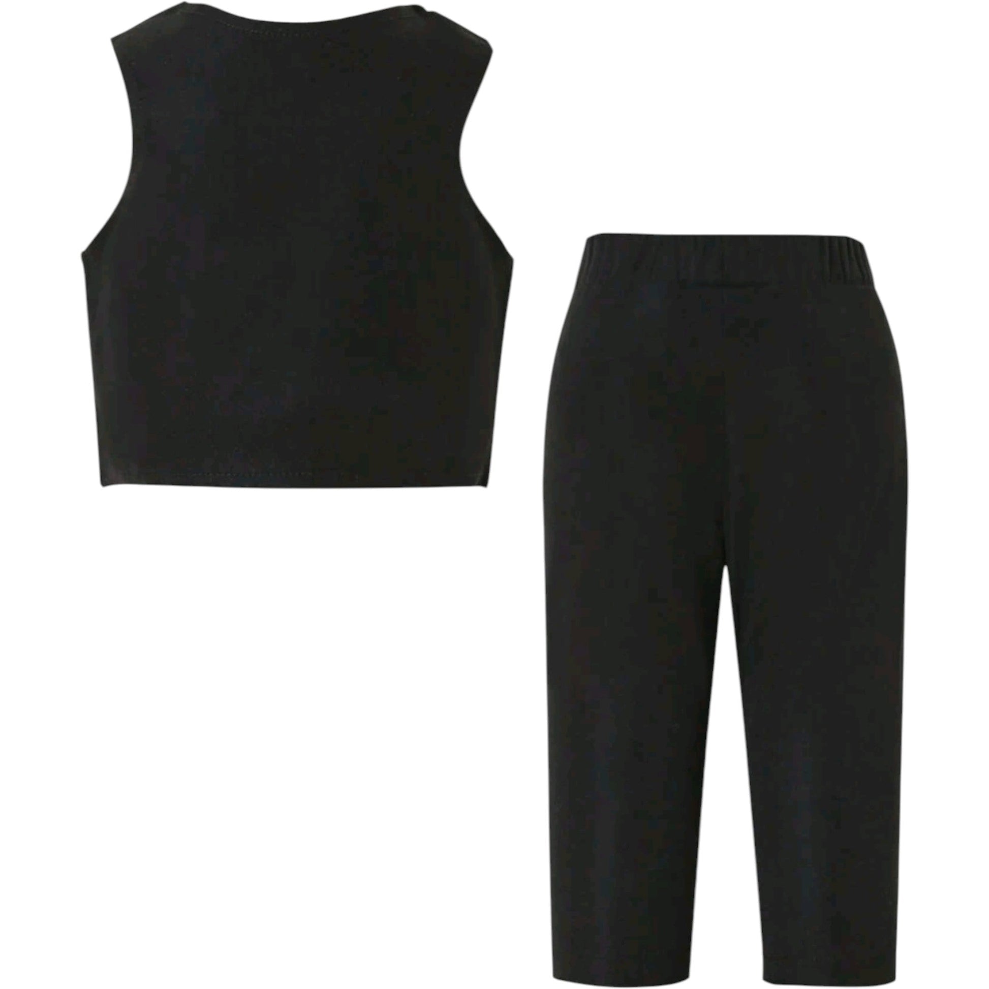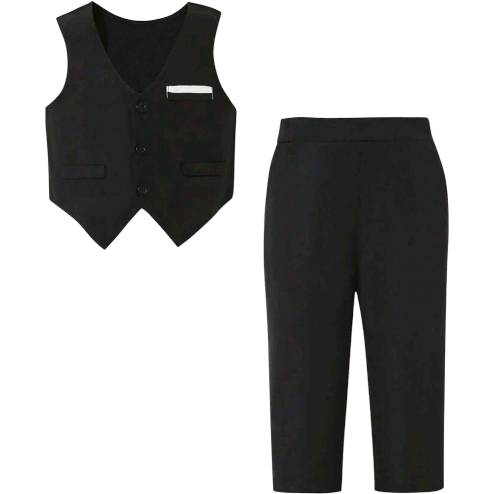 Címke nélküli, fekete szett. Mellény: V-nyakú mellény, gombokkal záródó, elején fehér zsebkendővel díszített zseb. Nadrág: 7/8-os hosszúságú, gumis derekú nadrág.