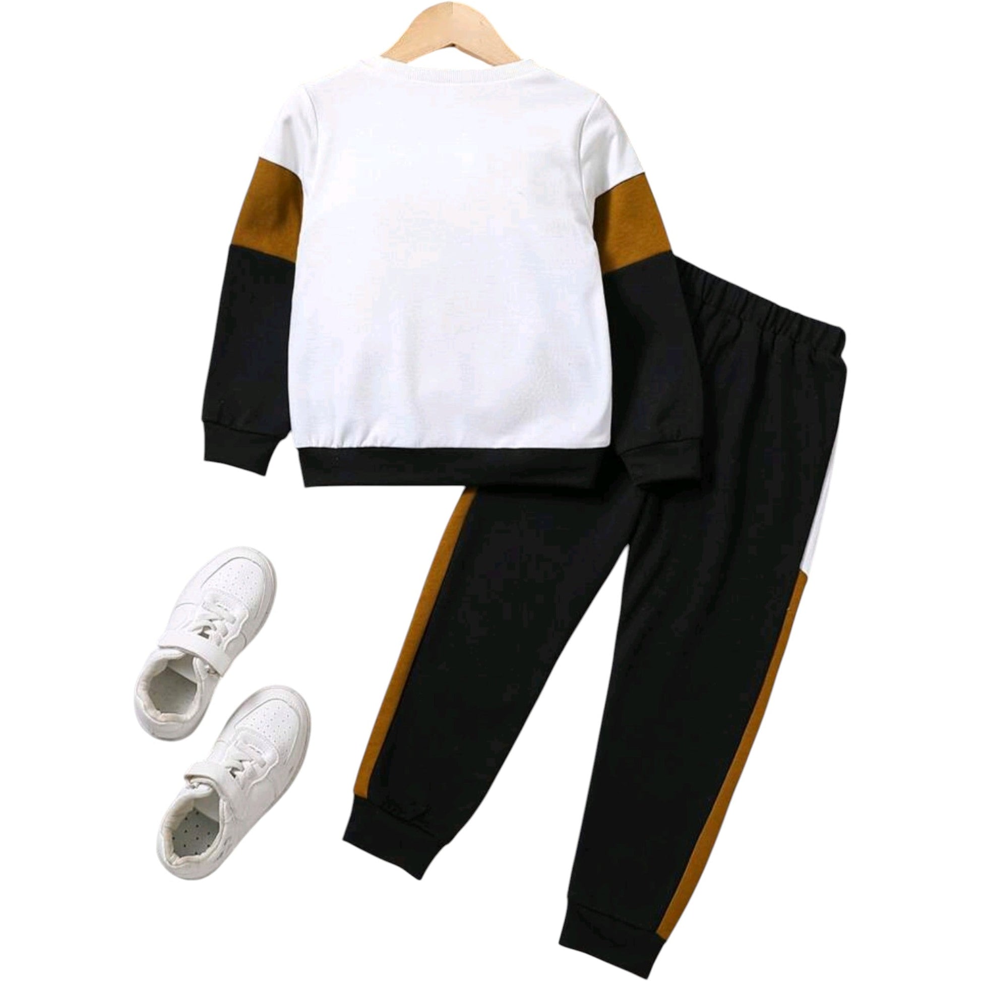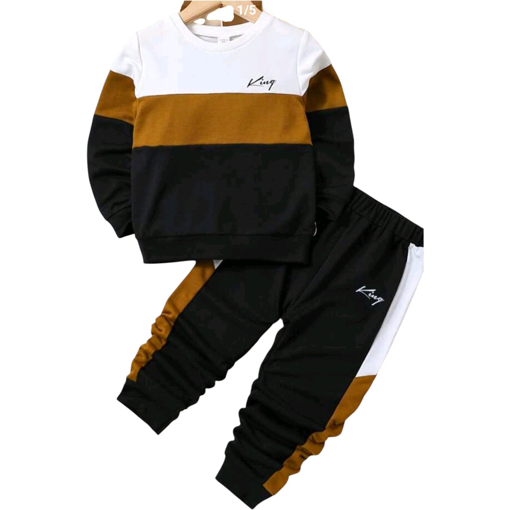 Címke nélküli. Pulóver: hosszú ujjú, színblokkos, fehér, barna/mustárszínű és fekete blokkokkal, kerek nyakú, bordázott passzés szegéllyel, az elején kis "King" felirat hímzéssel. Nadrág: fekete, gumis derekú, passzés szegélyű, színblokkos díszítéssel a szárakon (barna és fehér csíkokkal), az elején kis "King" felirat hímzéssel.