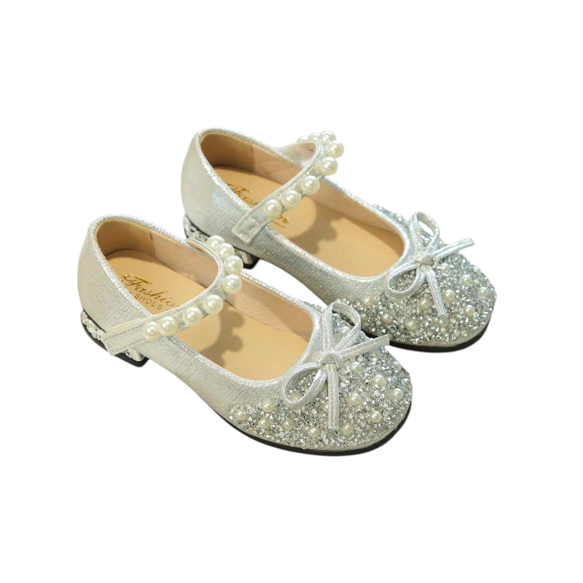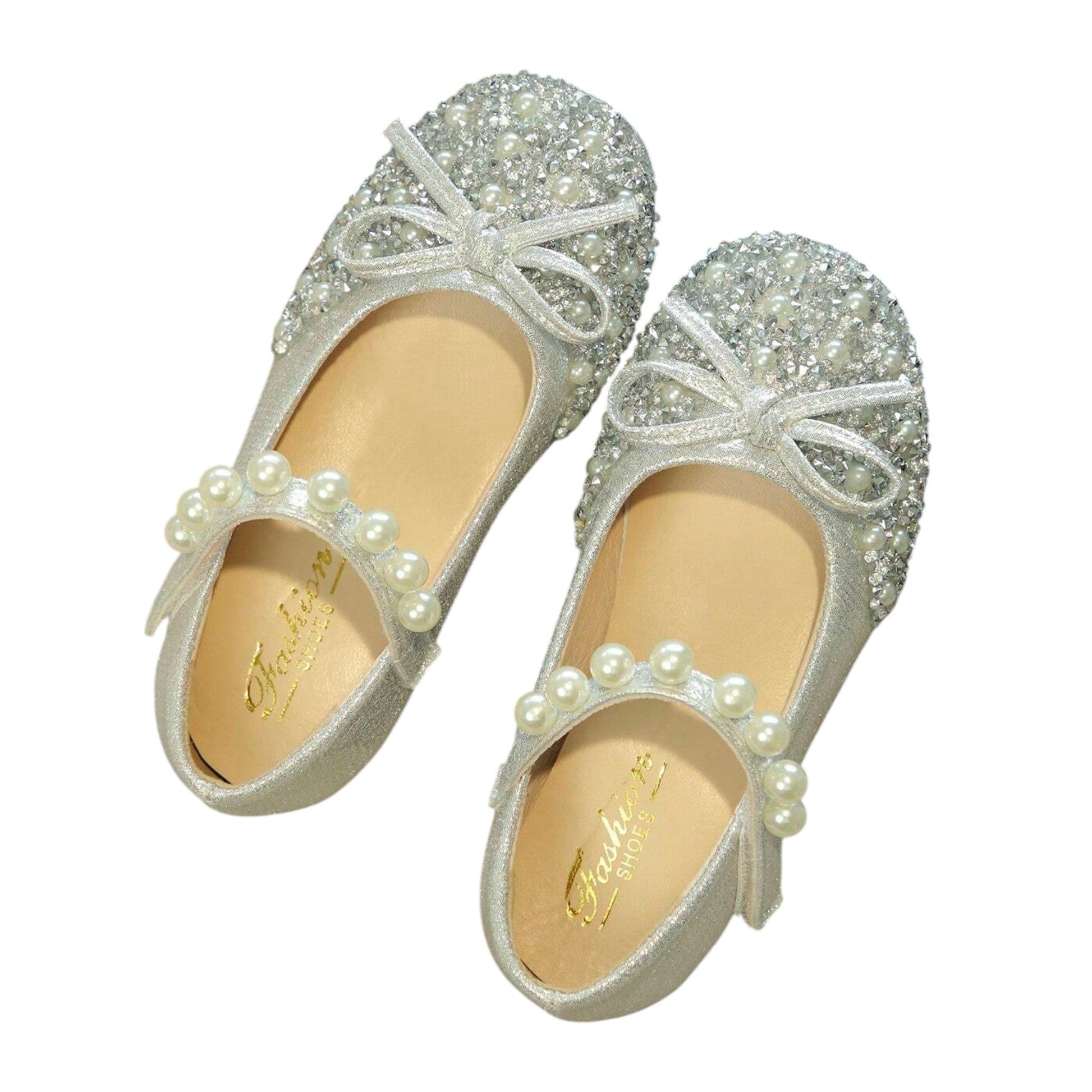 Címke nélküli, ezüst színű, glitteres, gyöngyökkel és masnival díszített gyerek cipő. Belső talp hossz: 15cm