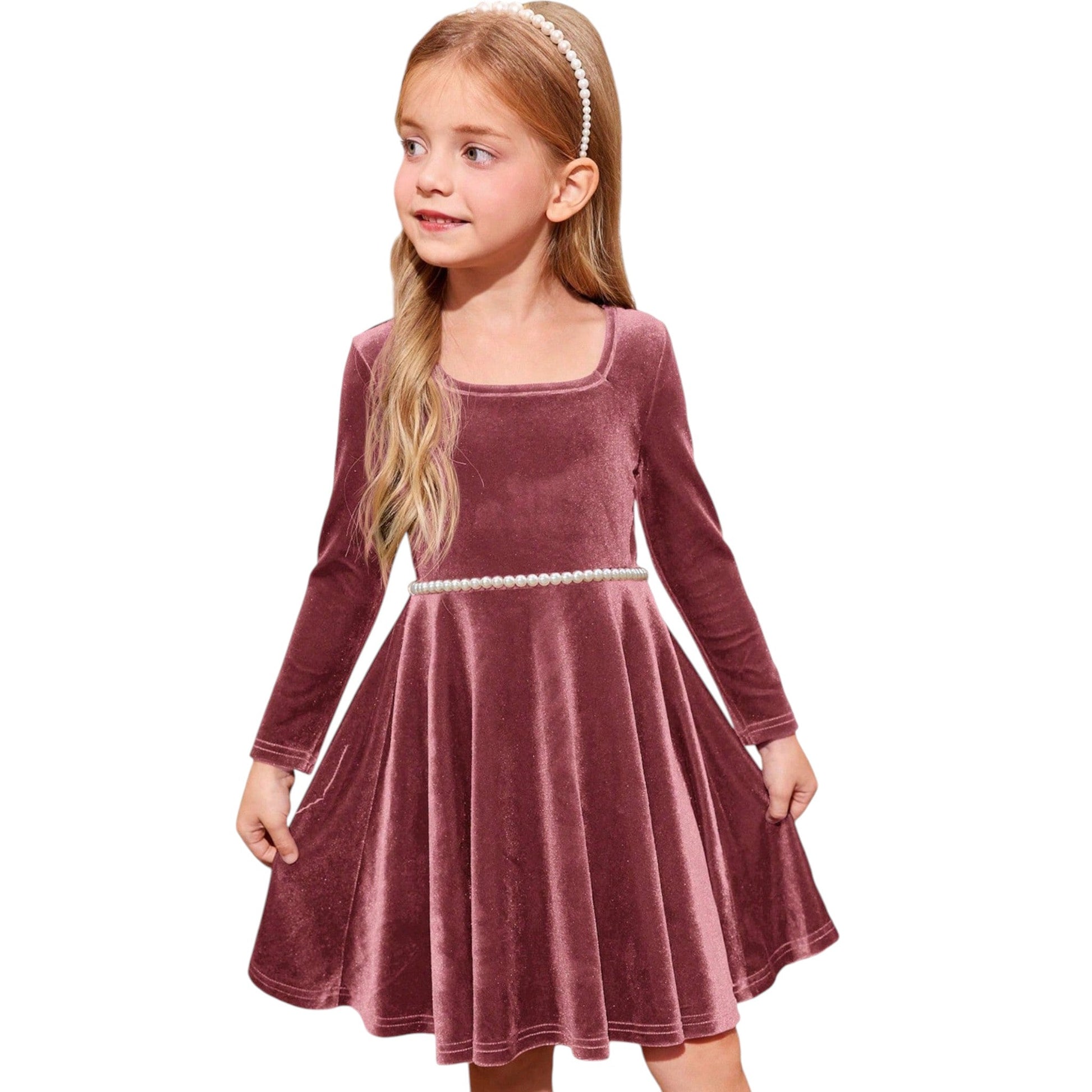 Címke nélküli, bordó színű, hosszú ujjú, A-vonalú szabású, bársony ruha, gyöngyös övvel.