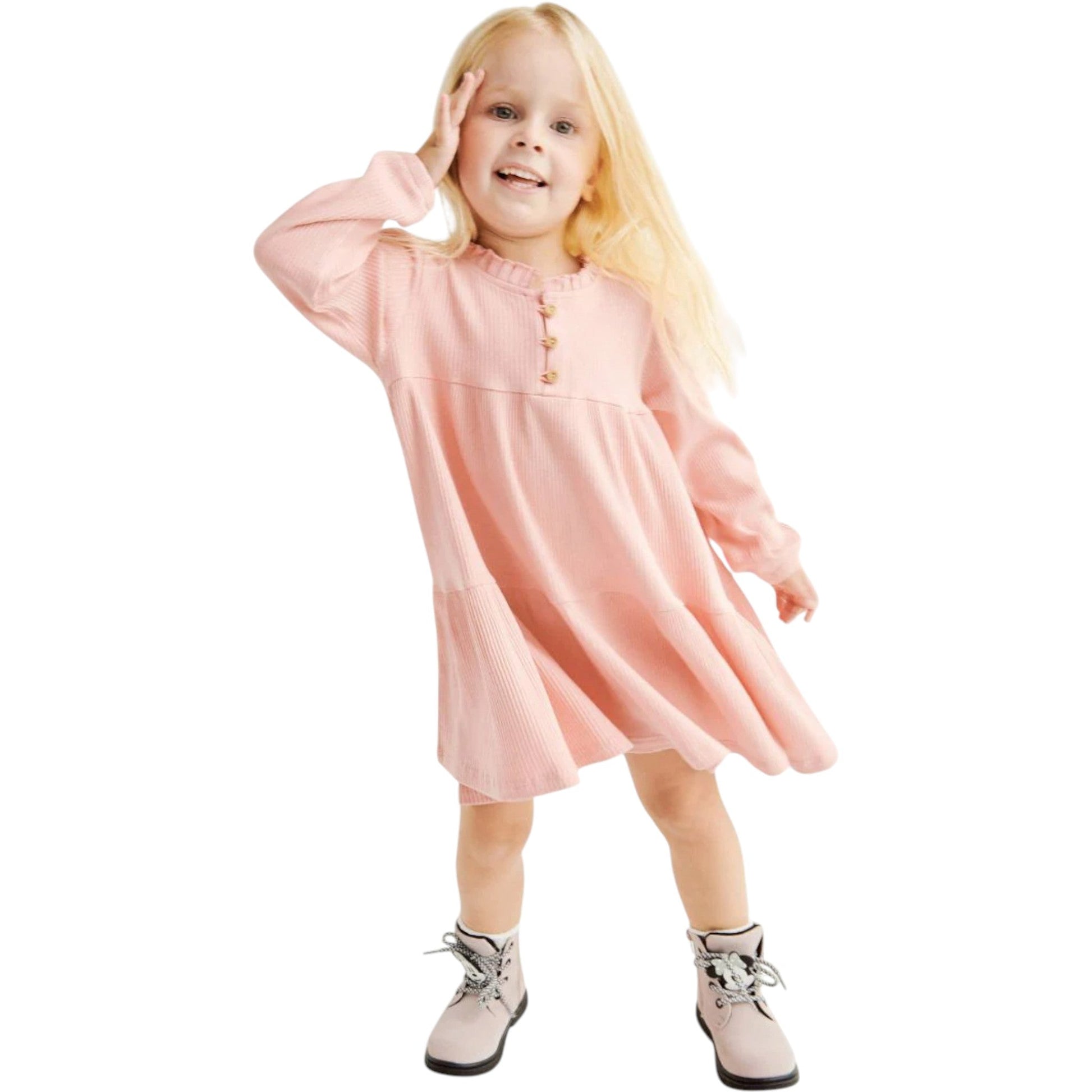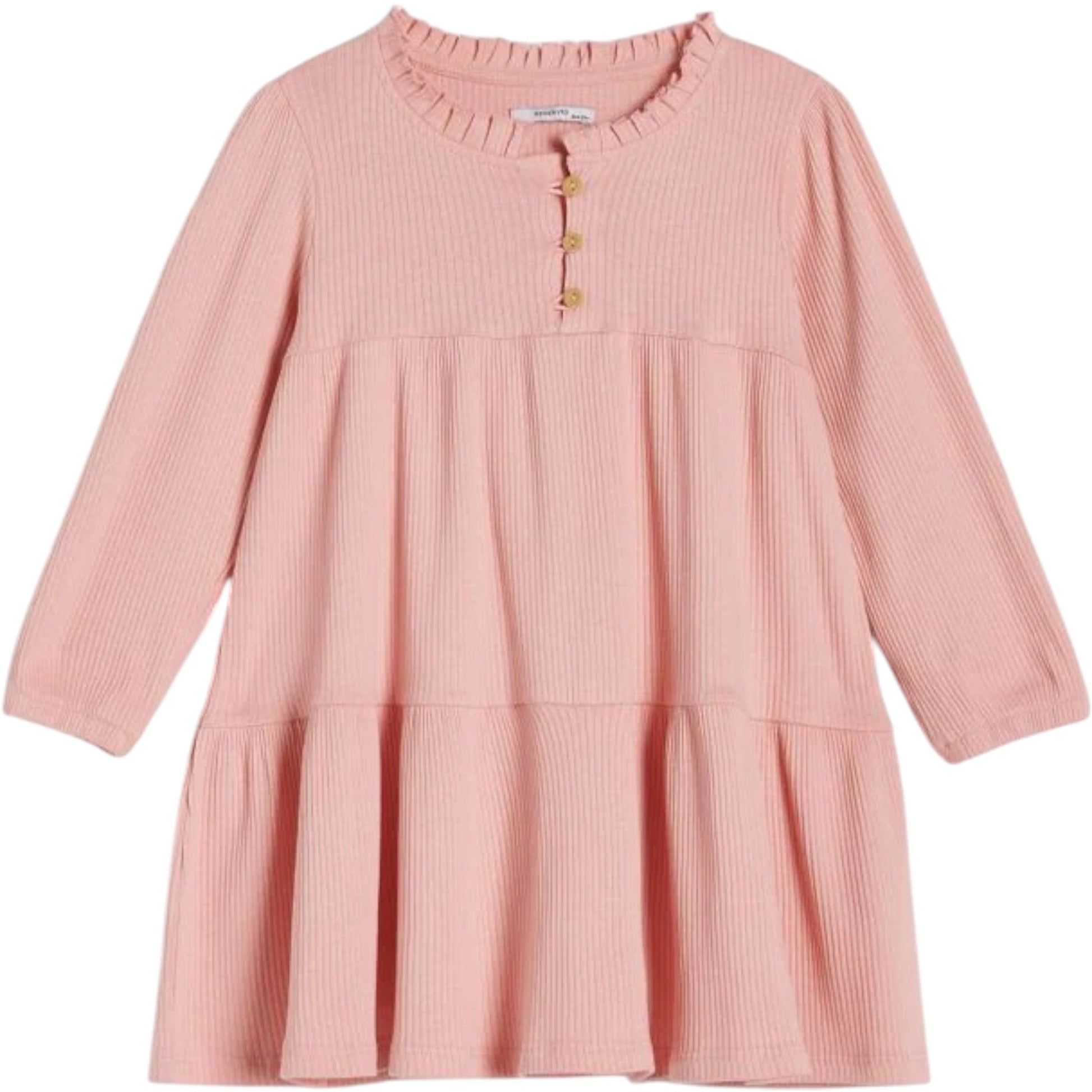 Címke nélküli, rózsaszín, bordázott (rib) anyagú, hosszú ujjú, kerek fodros nyakú, elöl gombokkal díszített, laza szabású, rövid ruha.