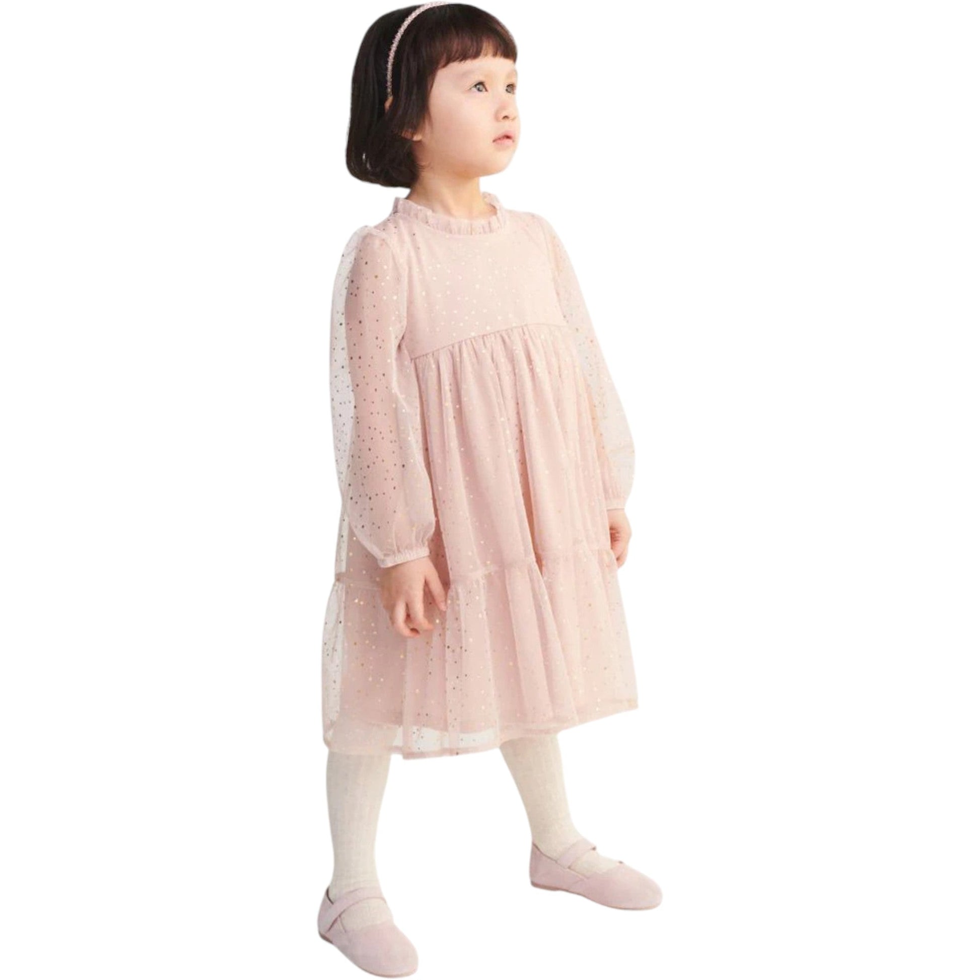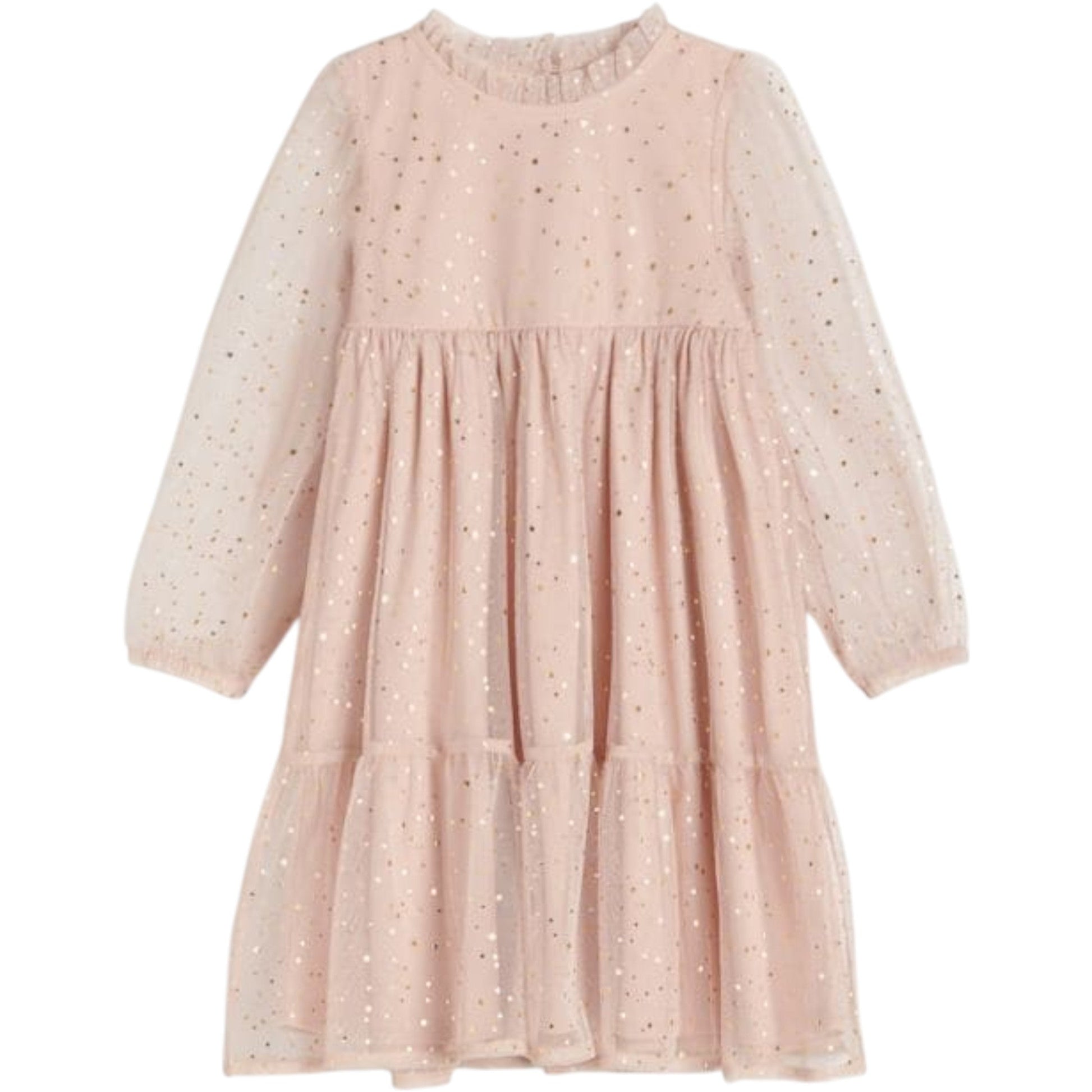 Címke nélküli, púder rózsaszín, arany csillogó pöttyös tüll anyagú ruha. Hosszú ujjú, fodor a nyaknál, gumírozott derék.