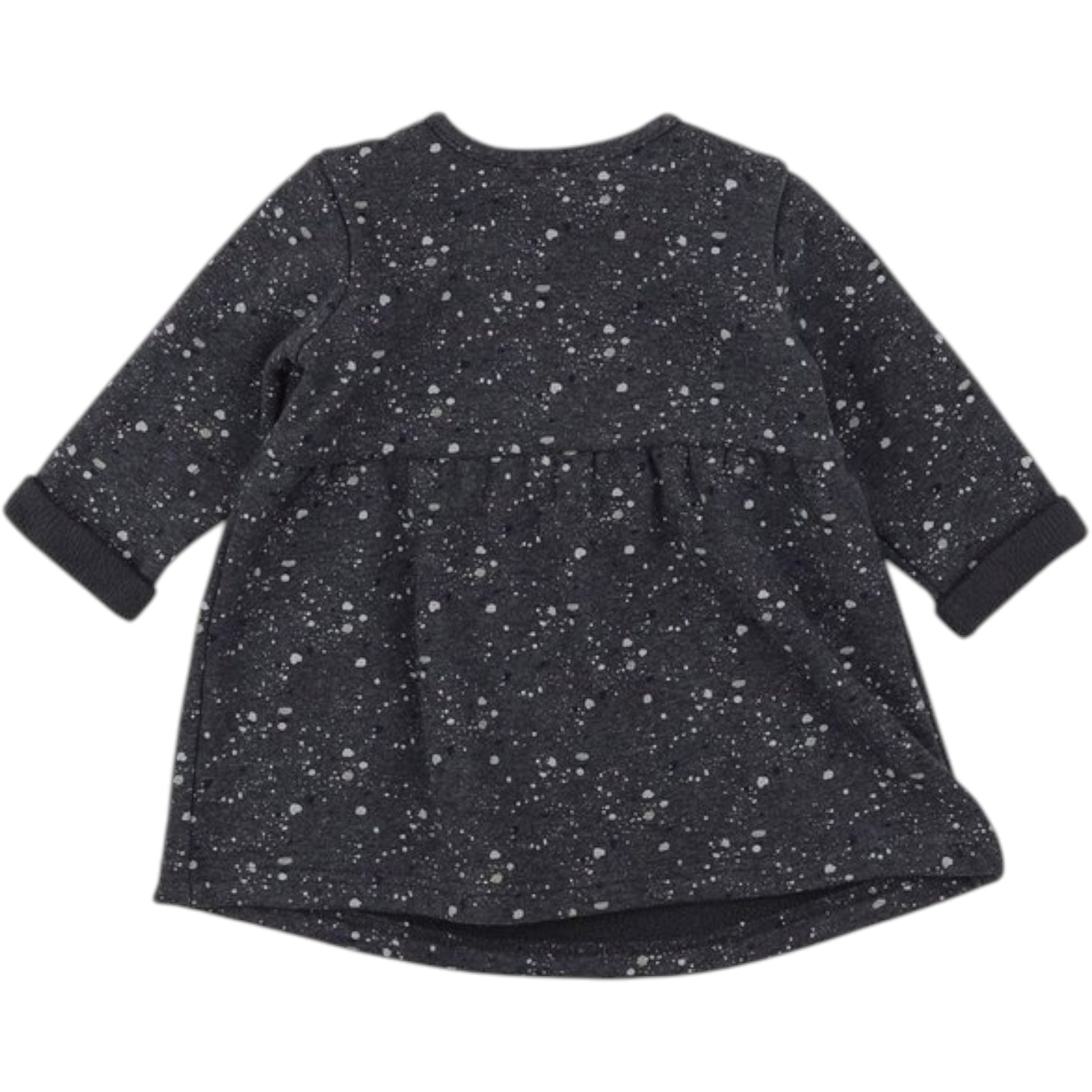 Címke nélküli, sötétszürke, vastag anyagú, plüss béléses mini ruha. Világos szórt pettyes mintával, hátulról fotózva, felhajtott ujjvégek.