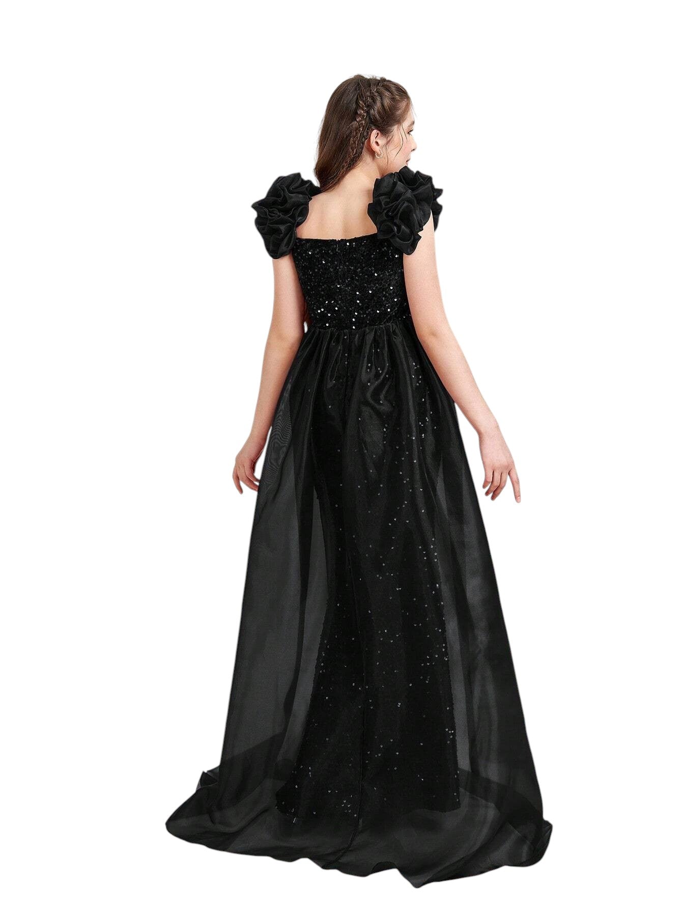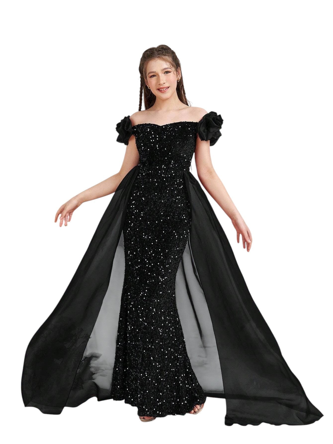 Címke nélküli, fekete, flitteres, vállat szabadon hagyó, rövid ujjú, tüll uszályos alkalmi ruha