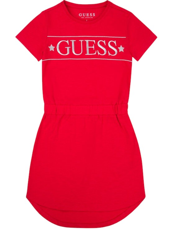 Címke nélküli, piros, pamutdzsörzé, pólóruha fazon, rövid ujjak, kerek nyak, gumis, húzózsinóros derék, "GUESS" logó csillagokkal a mellkason.