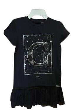 Címke nélküli, fekete, pamutdzsörzé és tüll, pólóruha fazon, rövid ujjak, kerek nyak, nagyméretű, díszített "G" logó, tüll fodros alsórész.